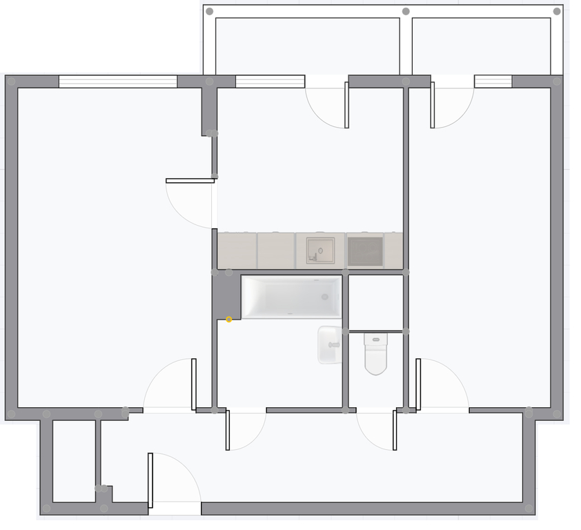 Dispozice bytu nabízí praktické a vzdušné řešení: prostorná předsíň s přístupem do samostatné komory, obývací pokoj průchozí do čtvercové kuchyně se vstupem na první balkon, neprůchozí ložnice se vstupem na druhý balkon. Koupelna je prostorná, vybavená vanou a místem pro pračku. K bytu náleží také sklepní kóje.