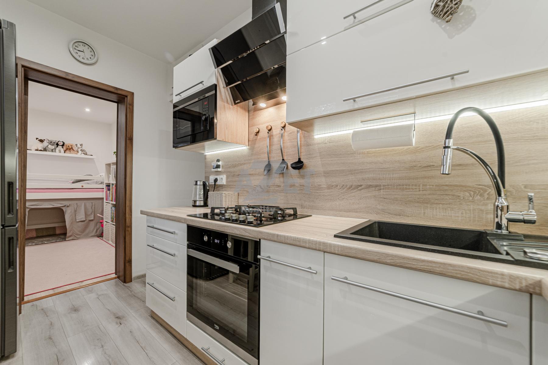 Umístění bytu je v 3. patře bytového domu (4. nadzemní podlaží). Byt nabízí neprůchozí místnosti kromě obývacího pokoje. Vstup do bytu je zajištěn bezpečnostními dveřmi. V chodbě bude ponechána vestavěná skříň v níž nalezneme jedny z prvních z vychytávek - zásuvku pro nabíjení ručního vysavače a posuvné dveře do obývacího pokoje a dětského pokoje zajišťující tak úsporu místa. WC je samostatné a koupelna díky promyšlenému uspořádání umožňuje umísit nejen pračku, ale také sušičku (skříňka nad pračkou se jen přesune). Kuchyně jenž byla provedena na míru majitelům poskytuje maximální praktičnost. Varná deska nyní plynová lze zaměnit za indukční , vše je na tuto změnu připraveno. Budou ponechány samozřejmě spotřebiče včetně lednice. Dětský menší přesto dostačující a bude při předání vyklizen. Obývací pokoj je svým umístěním středobodem celého bytu a najdeme v něm i jídelní část pro celou rodinu. Bude ponechán včetně vybavení vyjma TV. Ložnice, prostorná pro standardní manželkou postel a šatní skříň. Vybavení ložnice může být ponecháno po domluvě s majiteli. Z ložnice je vstup na prostorný, zasklený balkón. Na balkóně opět najdeme vychytávky v podobě stínících rolet, uzamykatelného zasklení a zásuvky pro vánoční světýlka či elektrický gril. Ložnici lze samozřejmě prohodit s nynějším dětským pokojem a dopřát dětem více prostoru.