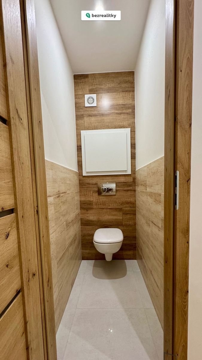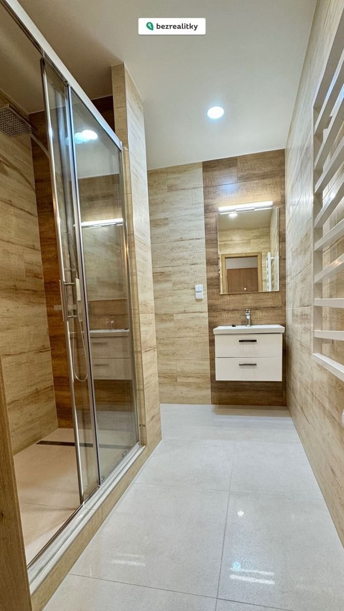 Velkou předností bytu je nadstandardně prostorná koupelna se sprchovým koutem a dostatkem místa pro pračku i sušičku. Toaleta je umístěna samostatně. V chodbě se nachází velká vestavěná skříň na míru, která nabízí spoustu úložného prostoru.