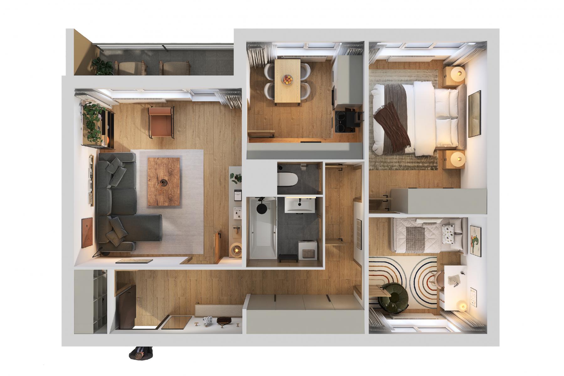 Dispozice je promyšlená tak, aby dávala smysl v reálném životě. Dostatek prostoru, samostatné místnosti a koupelna s vanou i místem pro pračku a sušičku. Nová kuchyně se spotřebiči se zárukou přirozeně funguje jako srdce domácnosti, kde se potkává každodenní život.