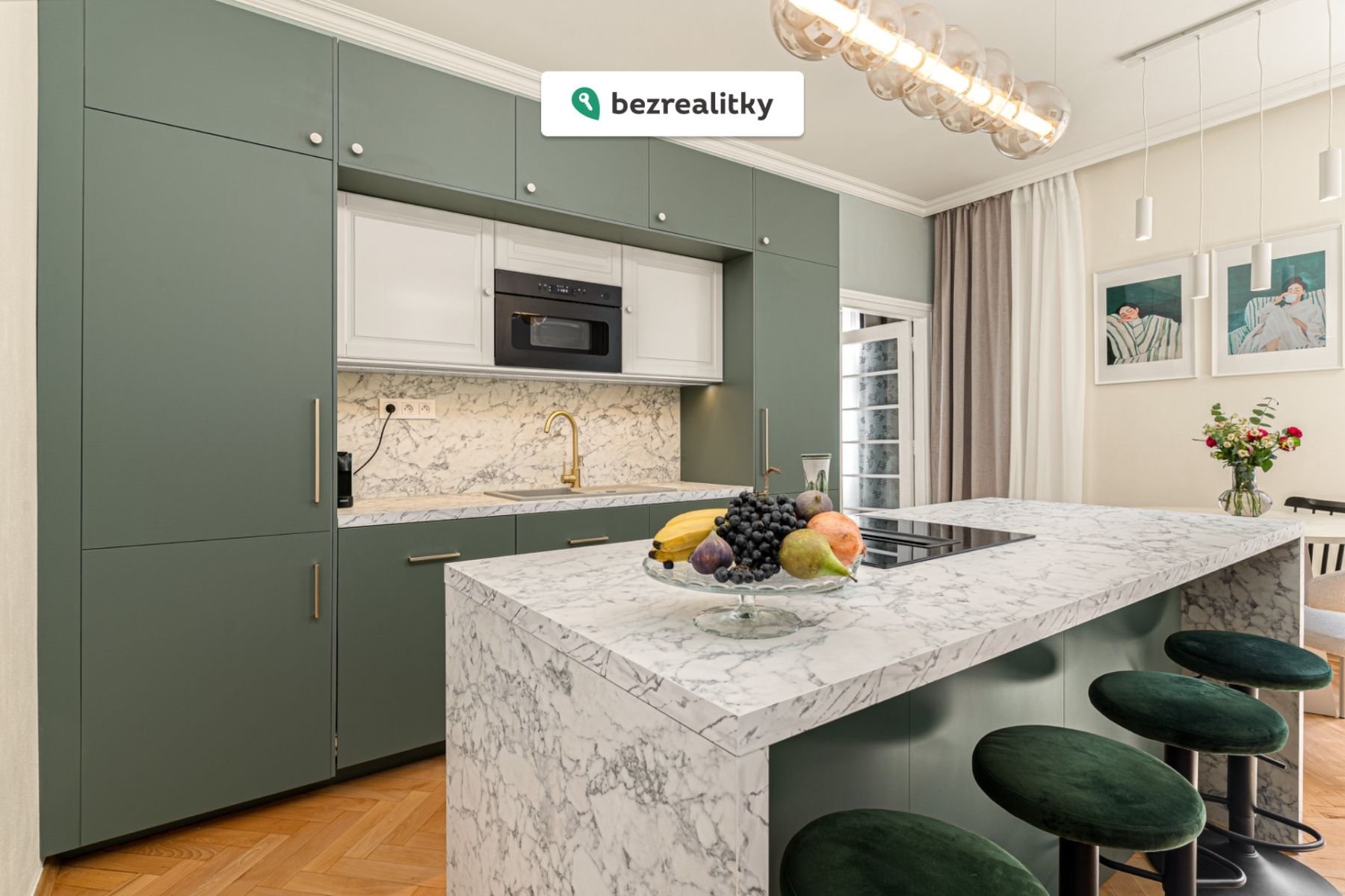 Dominantou bytu je otevřený obytný prostor s kuchyní a jídelnou, kde kuchyňský ostrůvek přirozeně propojuje celý byt a vytváří místo pro každodenní život i setkávání.