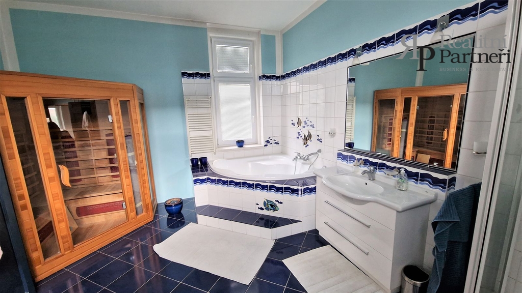 V prvním patře je vstupní chodba, samostatné WC, prostorná kuchyň, obytný pokoj, prostorný obývací pokoj, koupelna s vanou, sprchovým koutem a saunou.