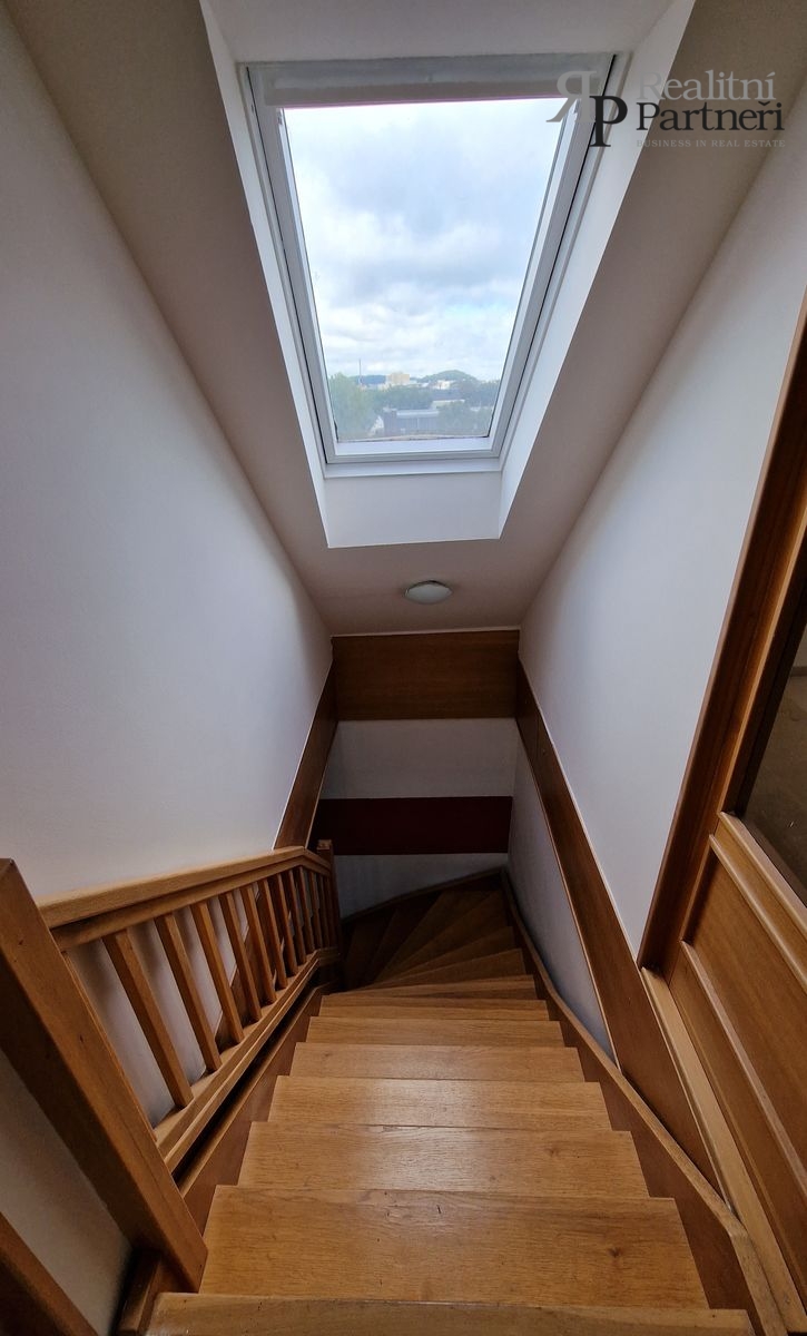Z obývacího pokoje vedou dubové schody do druhého patra bytu, kde se nachází dva obytné pokoje. Jeden z těchto pokojů má k dispozici šatnu.