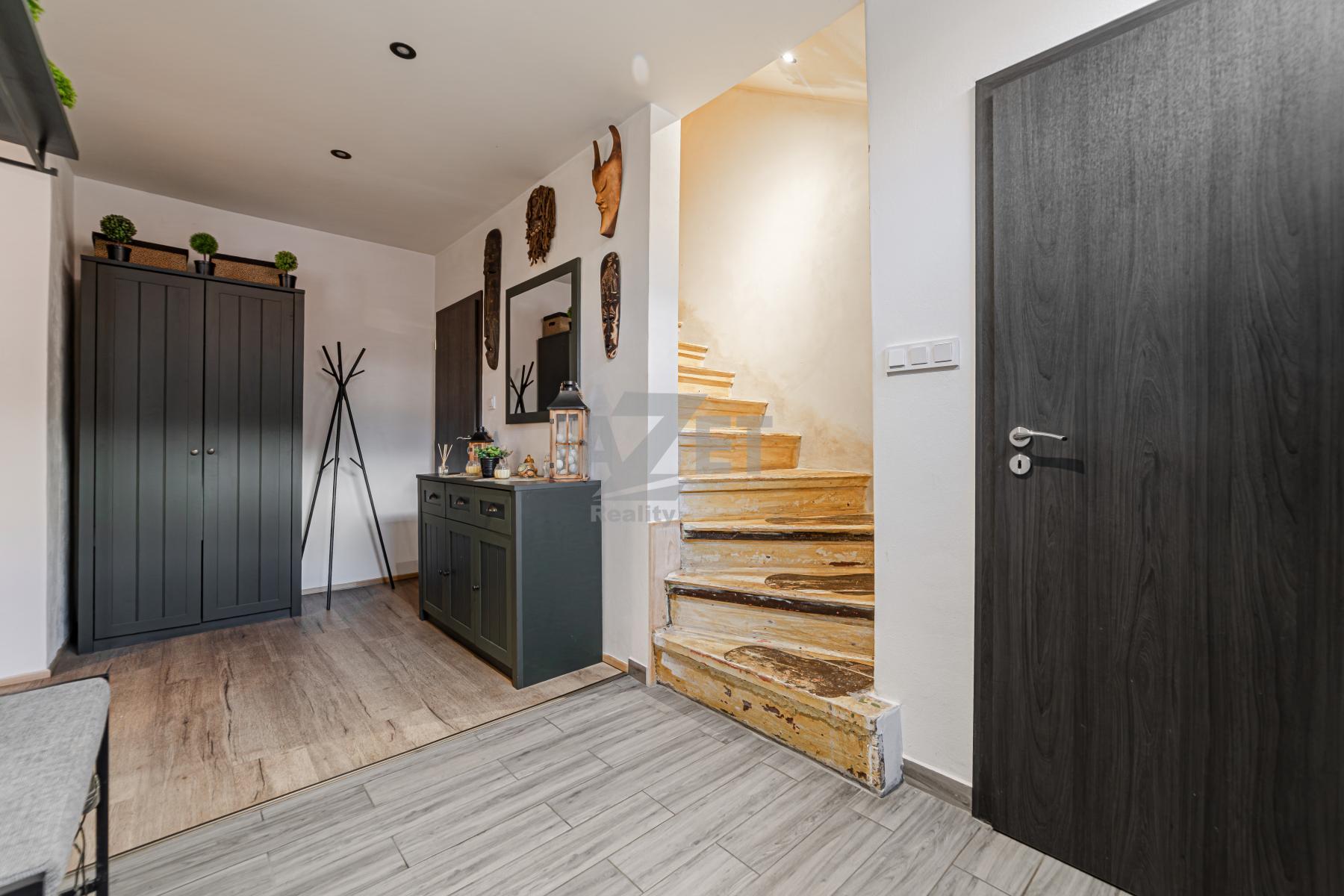 V prvním nadzemním podlaží, které prošlo rekonstrukcí se nachází prostorný obývací pokoj, který propojen s moderní kuchyní a vstupem na zahradu a zastřešenou terasu, dále se v tomto podlaží nachází koupelna se sprchovým koutem a chodba se vstupem do sklepa a schodištěm do patra.