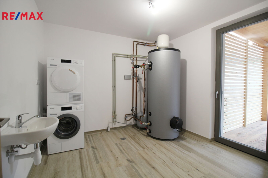 V technické místnosti je plynová přípojka, ve 2.NP klimatizace, v oknech venkovní žaluzie. Příprava na nabíjení elektroaut. V technické místnosti je pračka a sušička zn. Miele. Příprava na fotovoltaiku.
