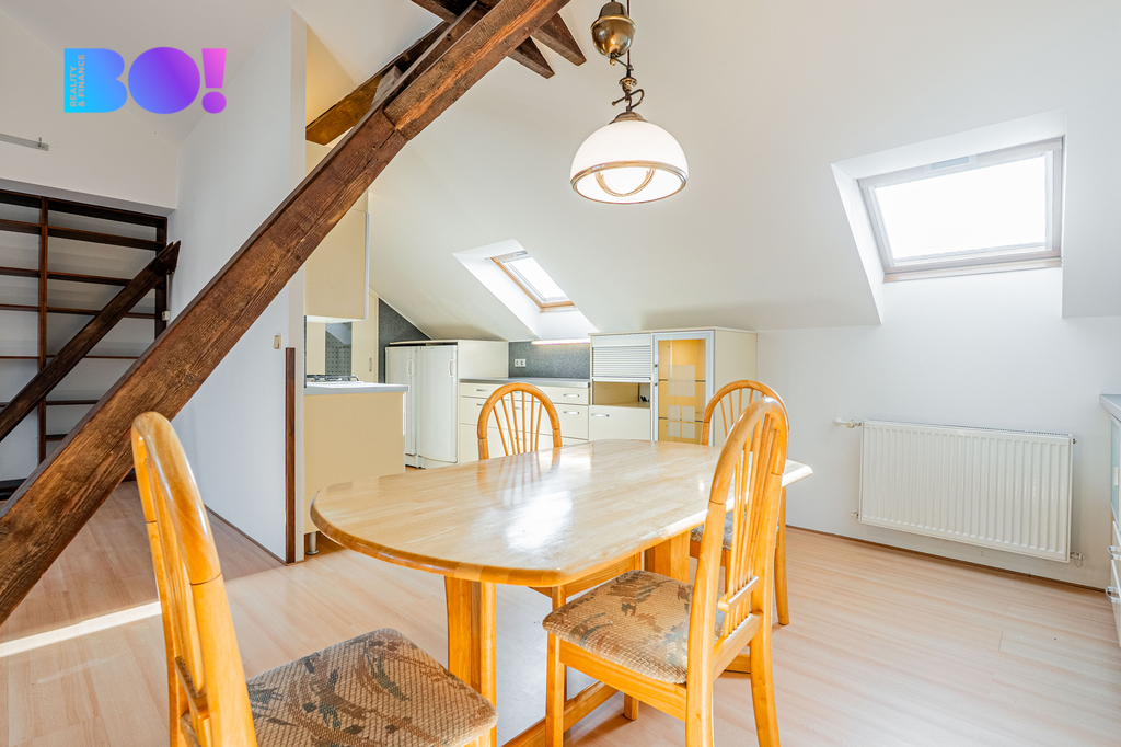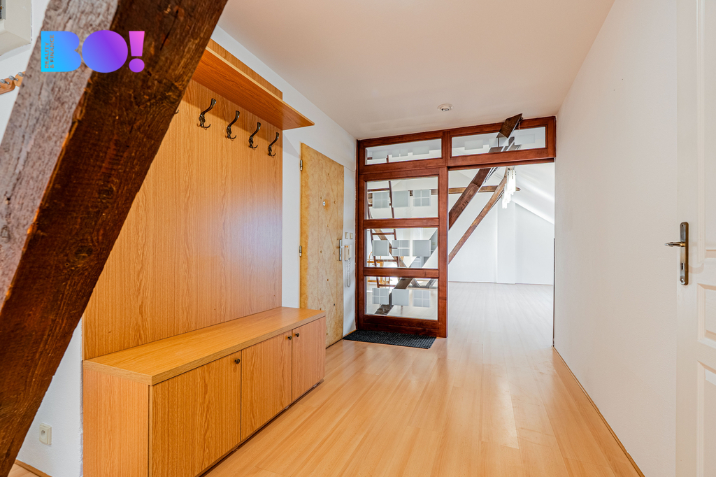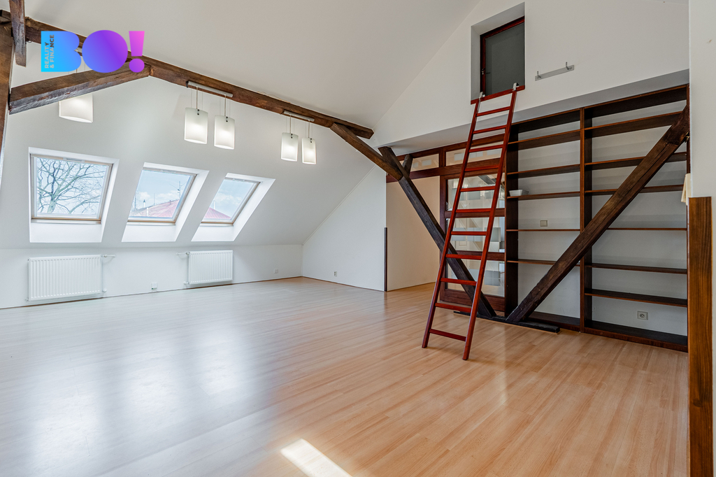 BO! reality Vám nabízí ke koupi atypický byt o dispozici 3+1 a celkové podlahové ploše 136m², v osobním vlastnictví. Součástí prodeje je řadová garáž (zastavěná plocha 23m²) na stejné ulici, jen přibližně 70 metrů od vchodu domu.