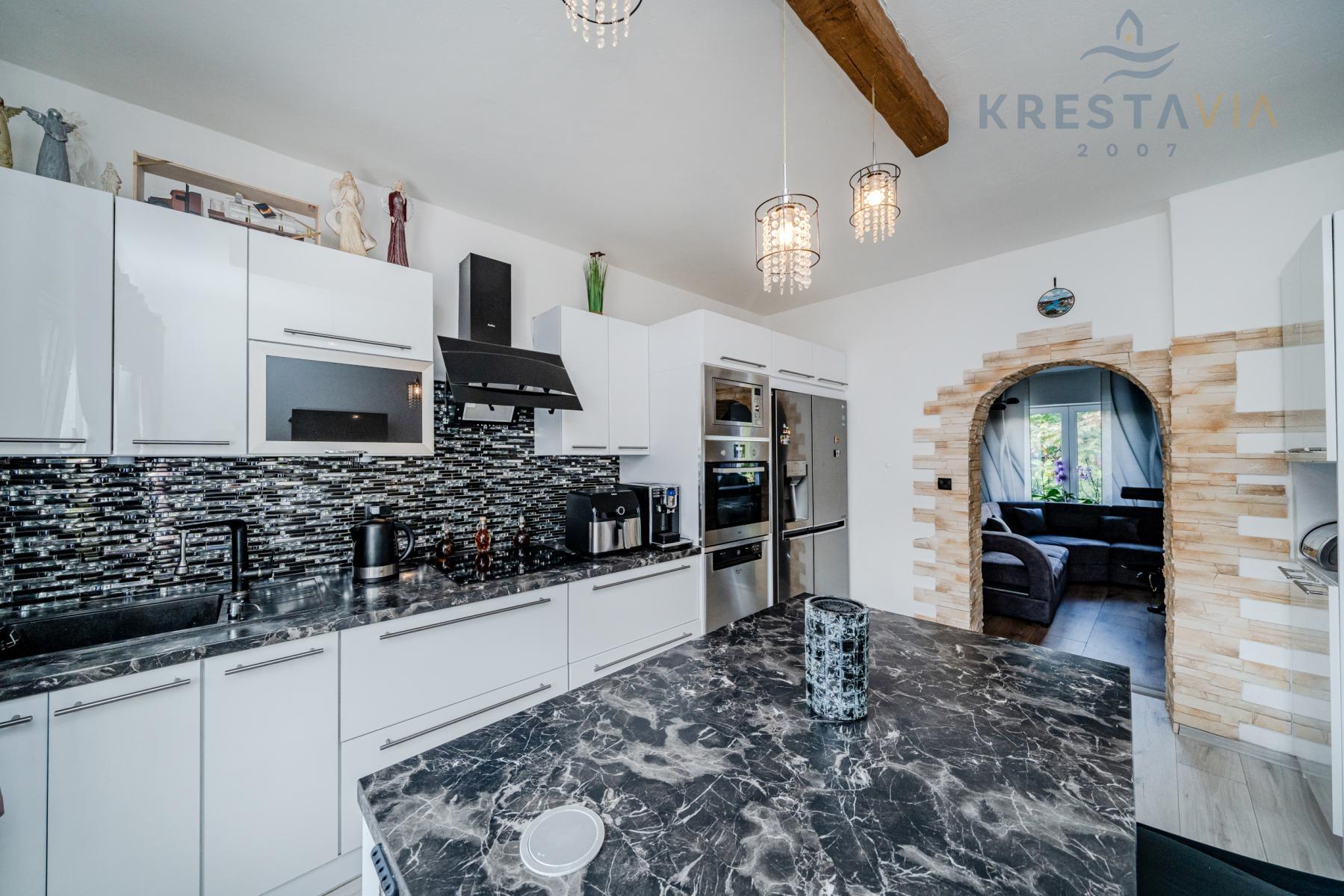 Dům s podlahovou plochou 135 m2 a dispozicí 4+1 disponuje stylovou černobílou kuchyní s ostrůvkem, velkorysým obývacím pokojem, dvěma koupelnami, ložnicí, dvěma dalšími pokoji, šatnou a dvěma vstupy do domu. Z obývacího pokoje lze přes zastřešenou terasu sejít na zahradu a užívat si tak čas s přáteli, či rodinou v pergole nebo letní dny u bazénu. Na zahradě je pro milovníky pěstování k dispozici také skleník. Dům je ze částečně podsklepený a poskytuje zázemí pro ekokotel na tuhá paliva a uskladnění dřeva.