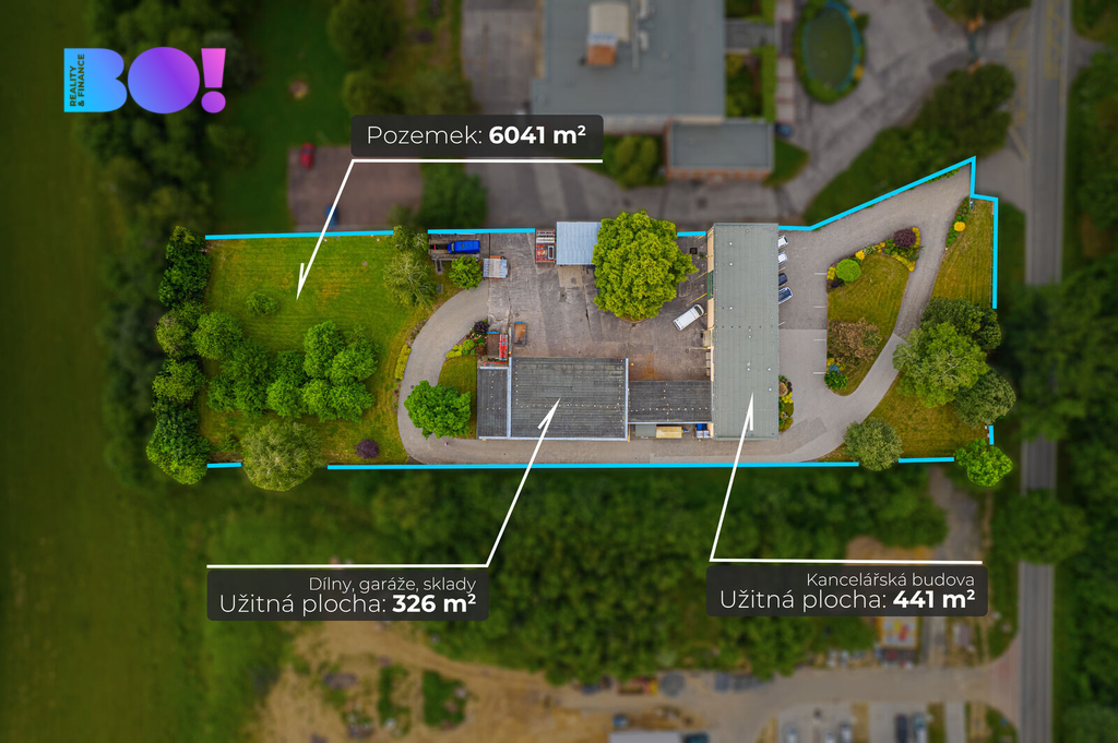 Areál se nachází na oploceném pozemku o rozloze 6 041 m² a nabízí široké možnosti využití. Kancelářské prostory, skladování až po výrobu či obchodní činnost.