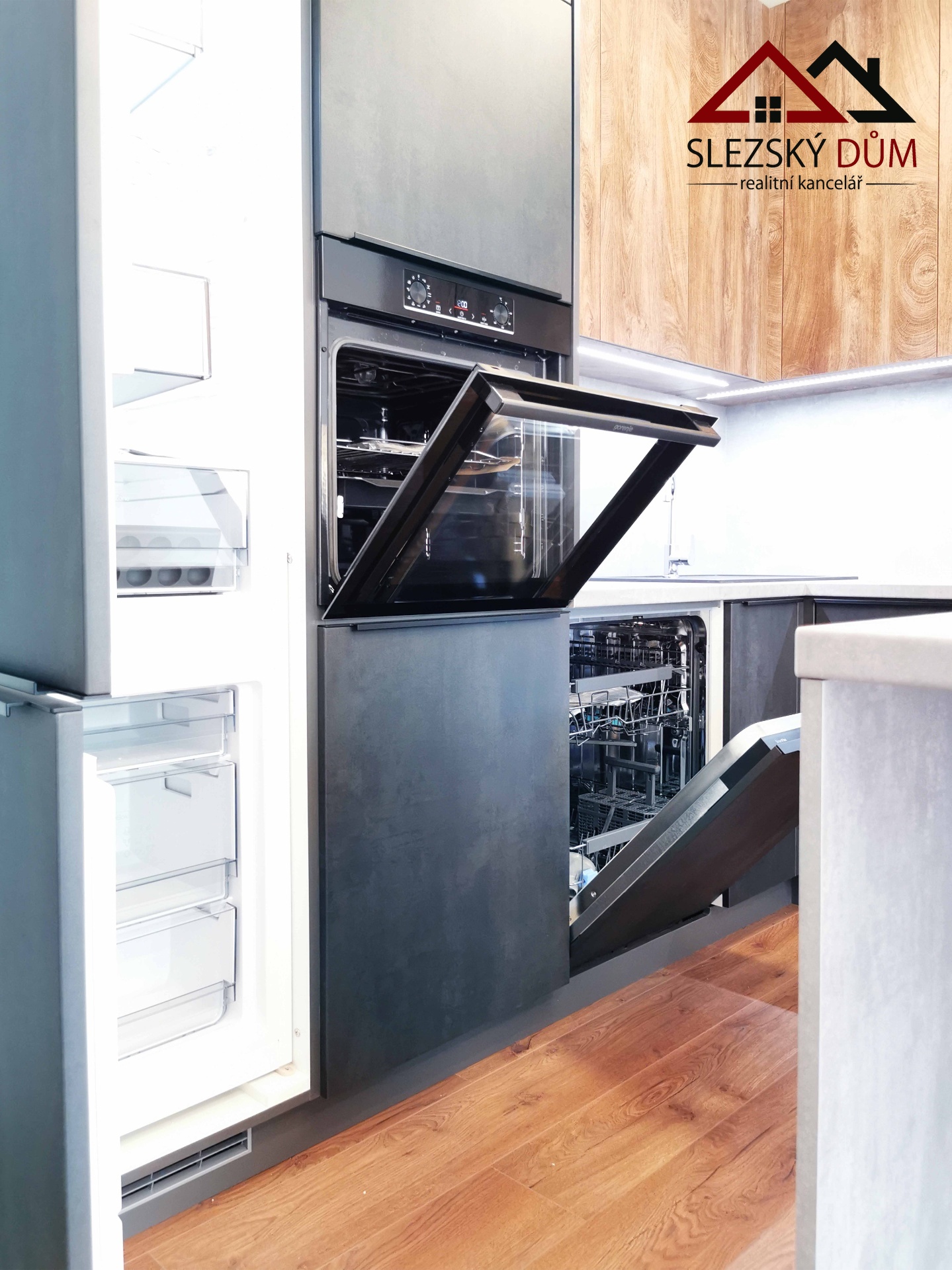 - k dispozici kuchyňská linka se spotřebiči (vestavěná lednice, mrazák, trouba, indukční deska, myčka), venkovní elektricky ovládané žaluzie