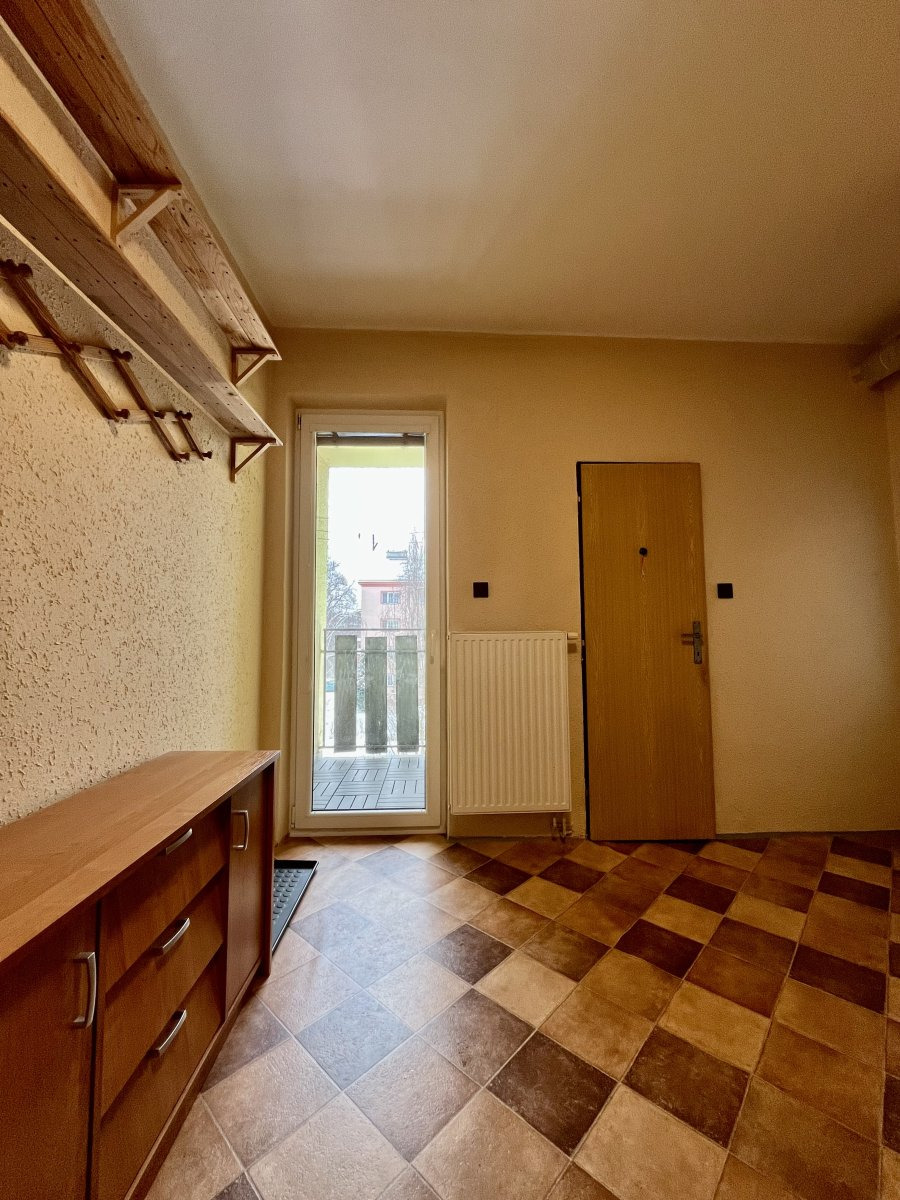 Dispozice bytu nabízí prostornou vstupní chodbu s vestavěnou šatní skříní a vstupy do jednotlivých místností – koupelny, samostatné toalety, kuchyně a na balkon. Z kuchyně se vstupuje do neprůchozího pokoje, který zajišťuje dostatek soukromí.