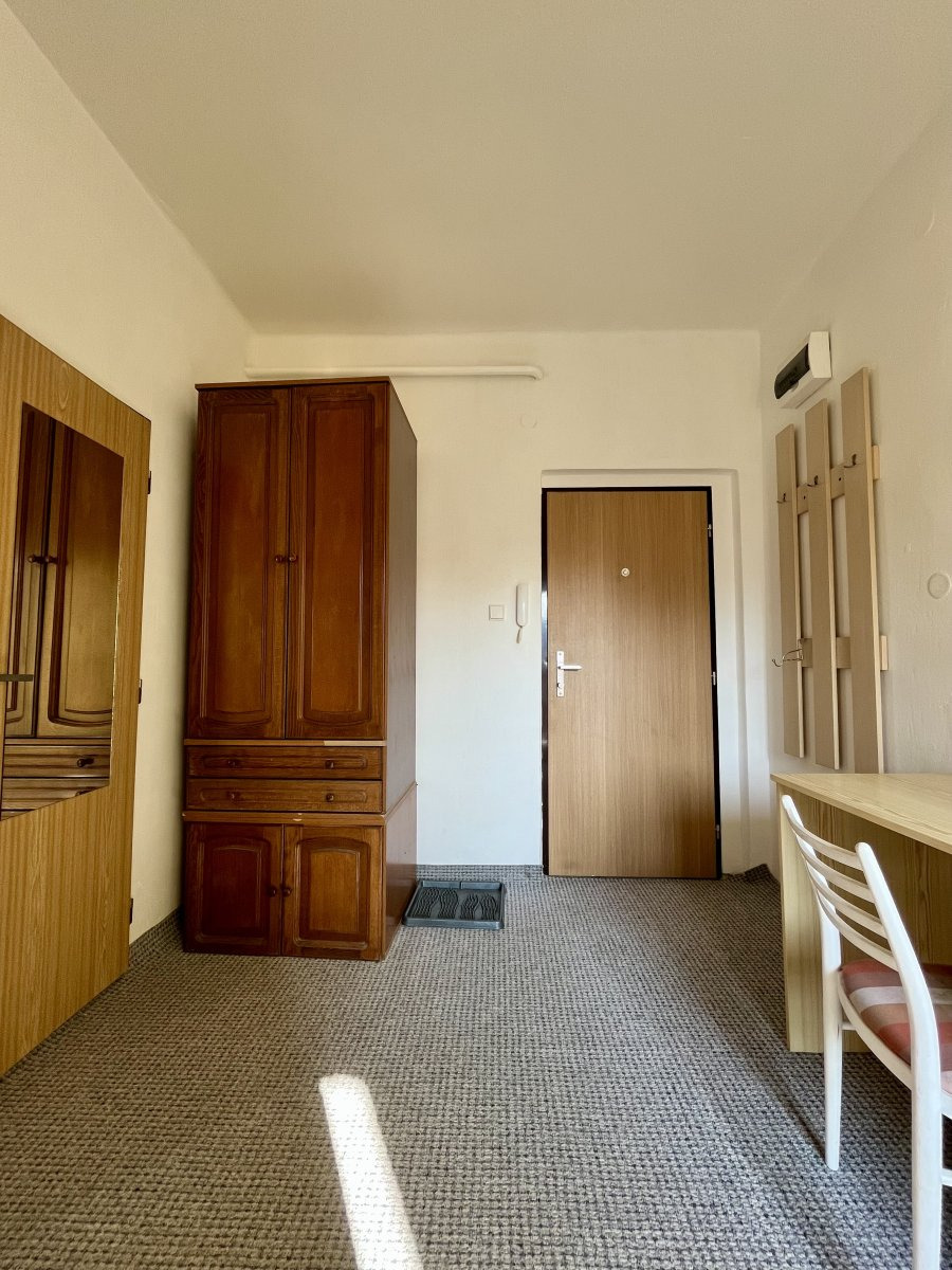 Dispozice bytu nabízí prostornou vstupní chodbu s vestavěnou šatní skříní a vstupy do jednotlivých místností – koupelny, samostatné toalety, kuchyně a na balkon. Z kuchyně se vstupuje do neprůchozího pokoje, který zajišťuje dostatek soukromí. Disponuje gaučem, postelemi a skříní.