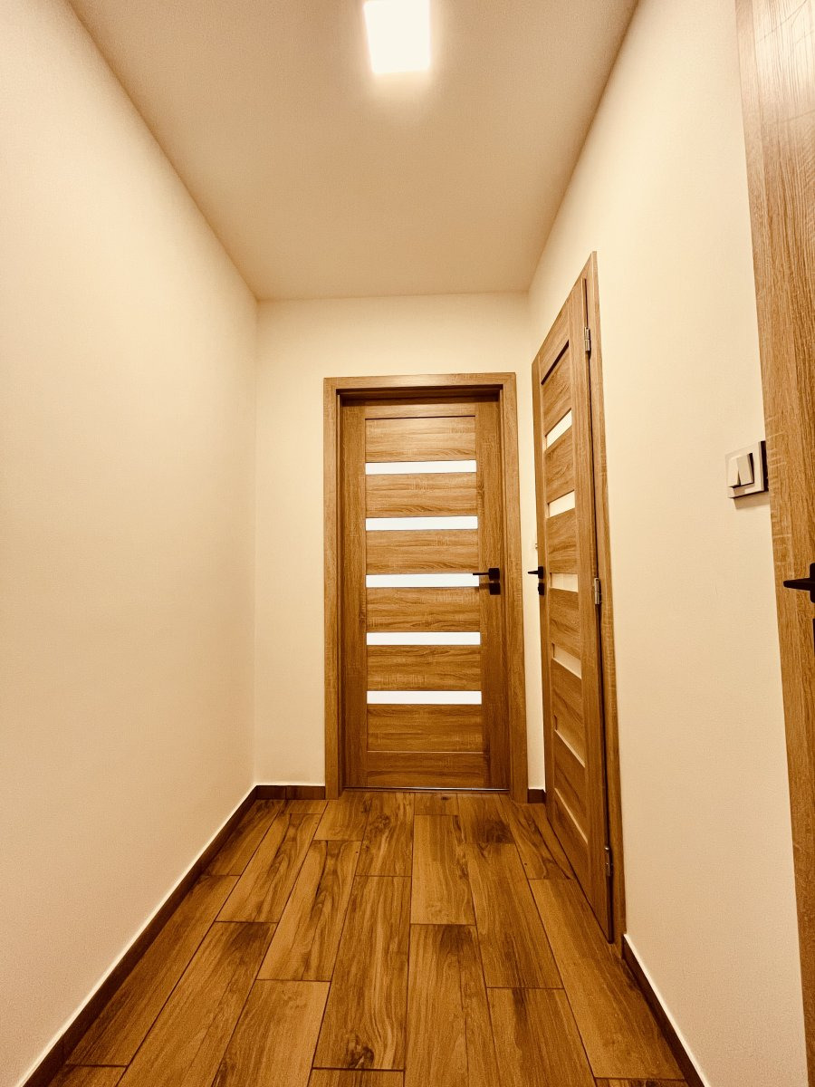 Kuchyně je vybavena novou kuchyňskou linkou, sklokeramickou deskou s elektrickou troubou s digestoří a myčkou. V bytě je nová elektřina i nová koupelna, která je vybavena sprchovým koutem a je zde místo na pračku. Toaleta je umístěna samostatně