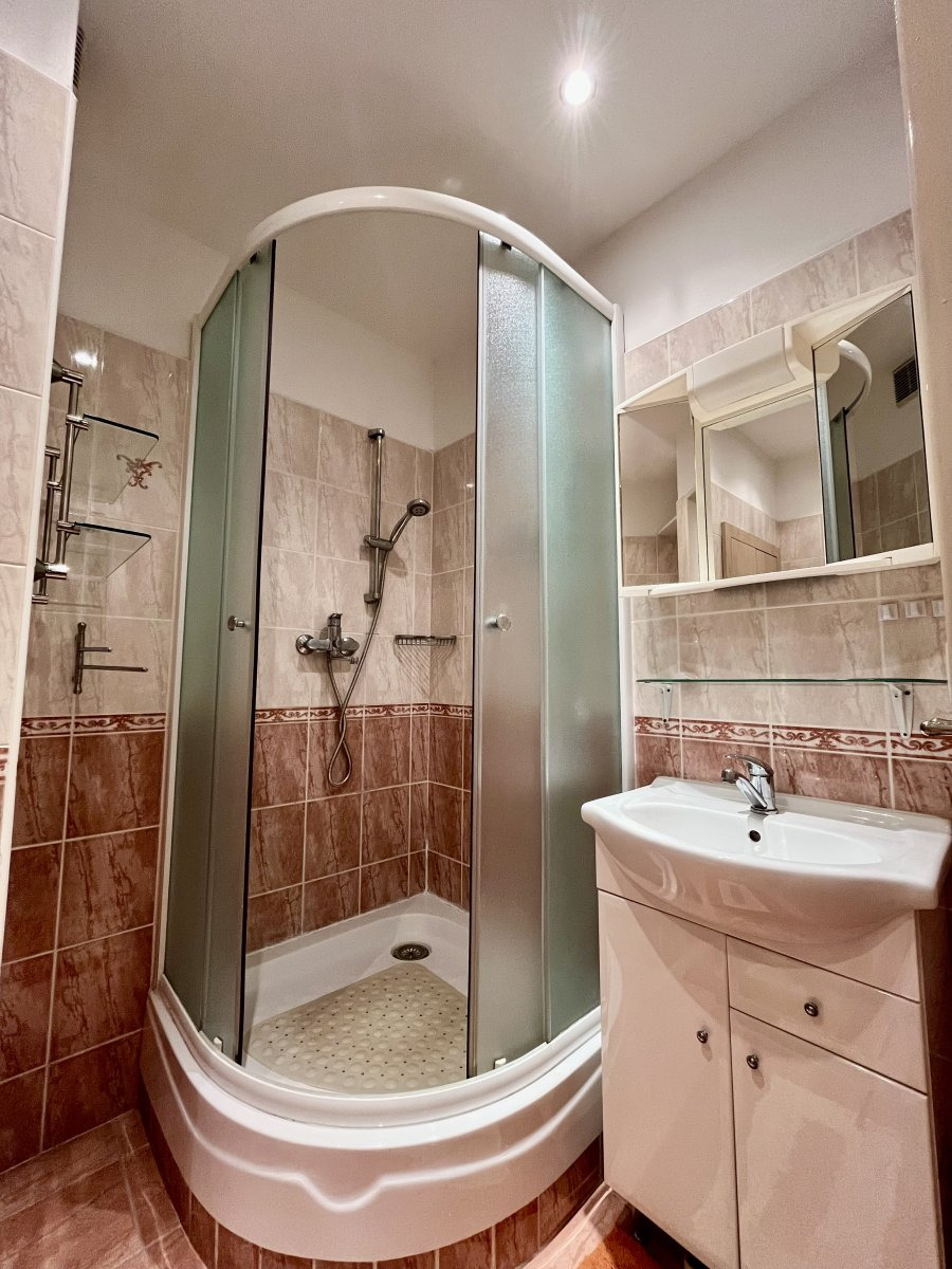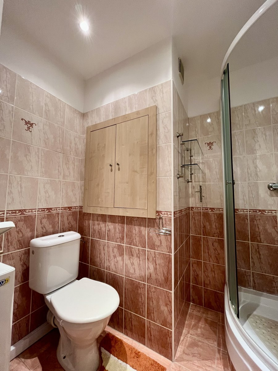 V koupelně najdeme sprchový kout i toaletu, umyvadlo a pračku.