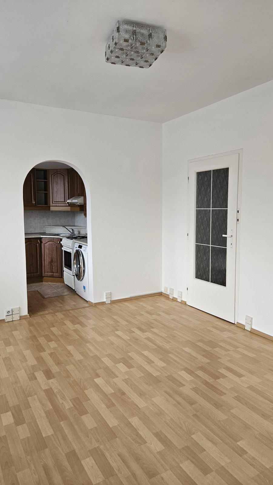 Přes obývací pokoj vstup do ložnice a do kuchyně. Na podlaze plovoucí podlaha.