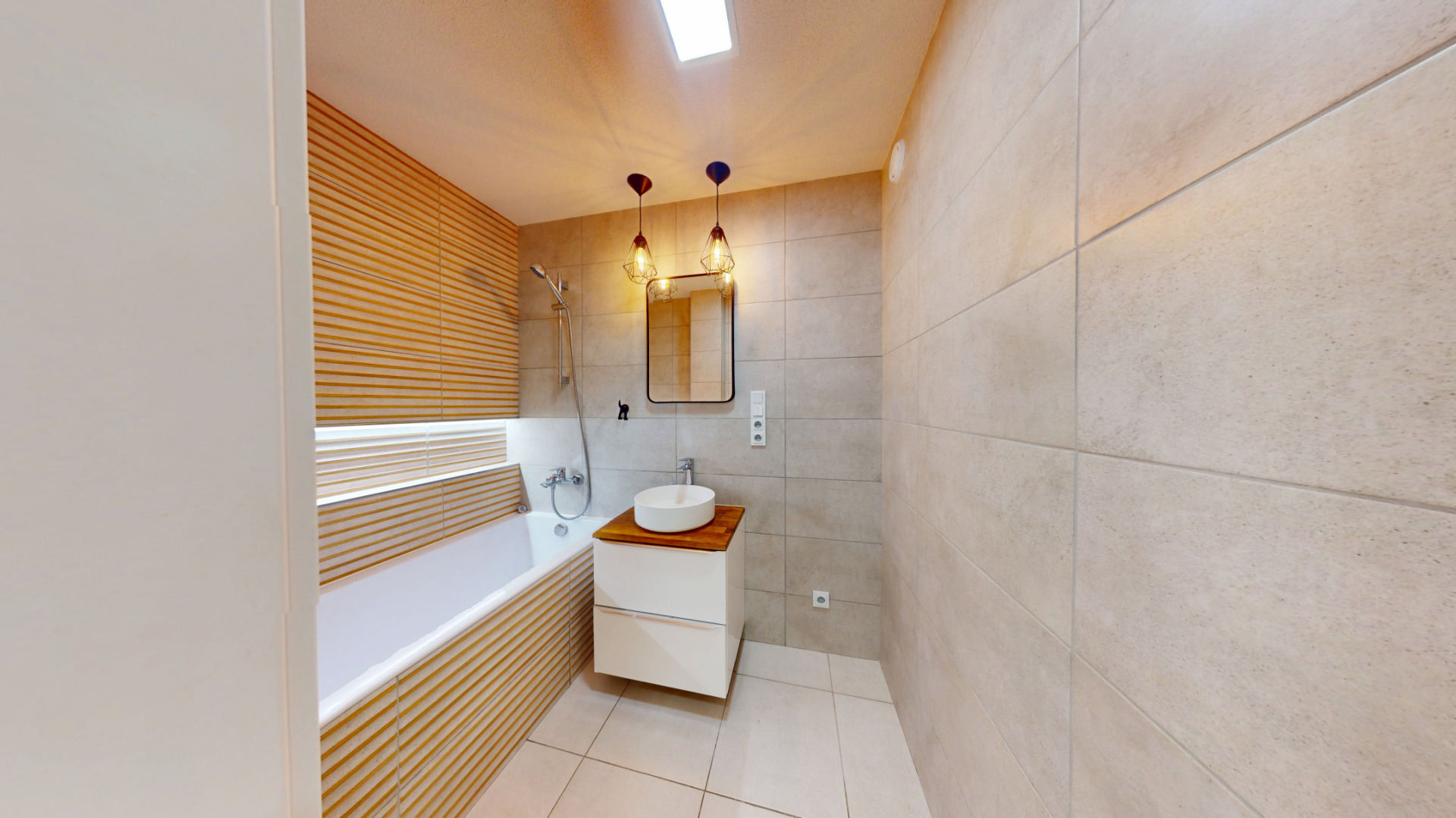 V bytě jsou položeny moderní plovoucí podlahy. Kuchyně je plně vybavena vestavěnými spotřebiči – elektrickou troubou, mikrovlnnou troubou, varnou deskou, digestoří a myčkou nádobí. Koupelna disponuje vanou, umyvadlovou skříňkou a přípojkou na pračku. Toaleta je oddělena, což zvyšuje komfort bydlení.