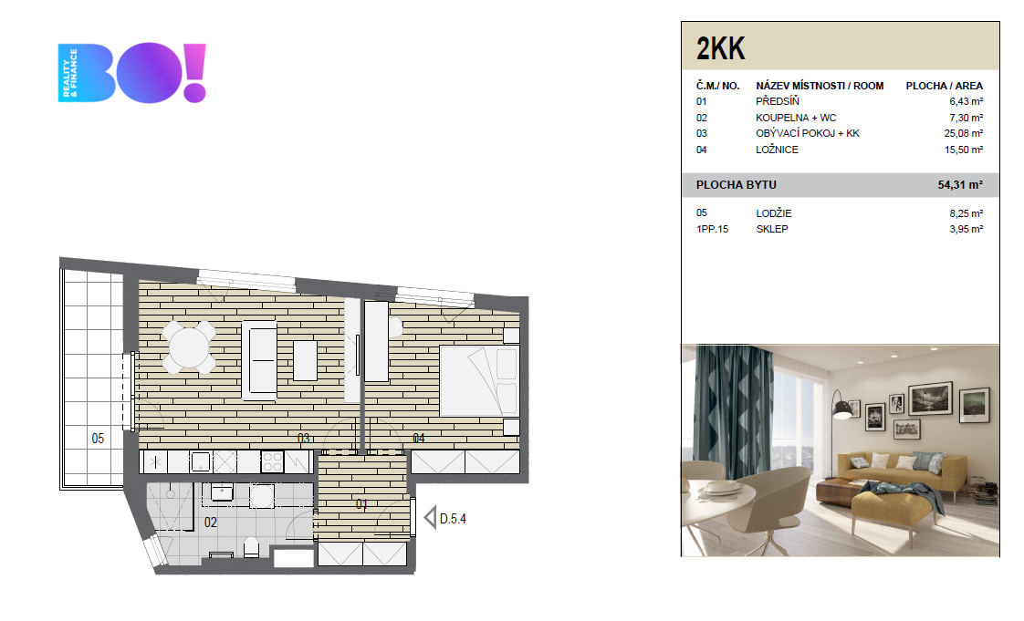 Byt o podlahové ploše 54 m² a lodžií 8 m² je šikovně dispozičně řešen tak, aby nabízel dostatek prostoru pro komfortní život.