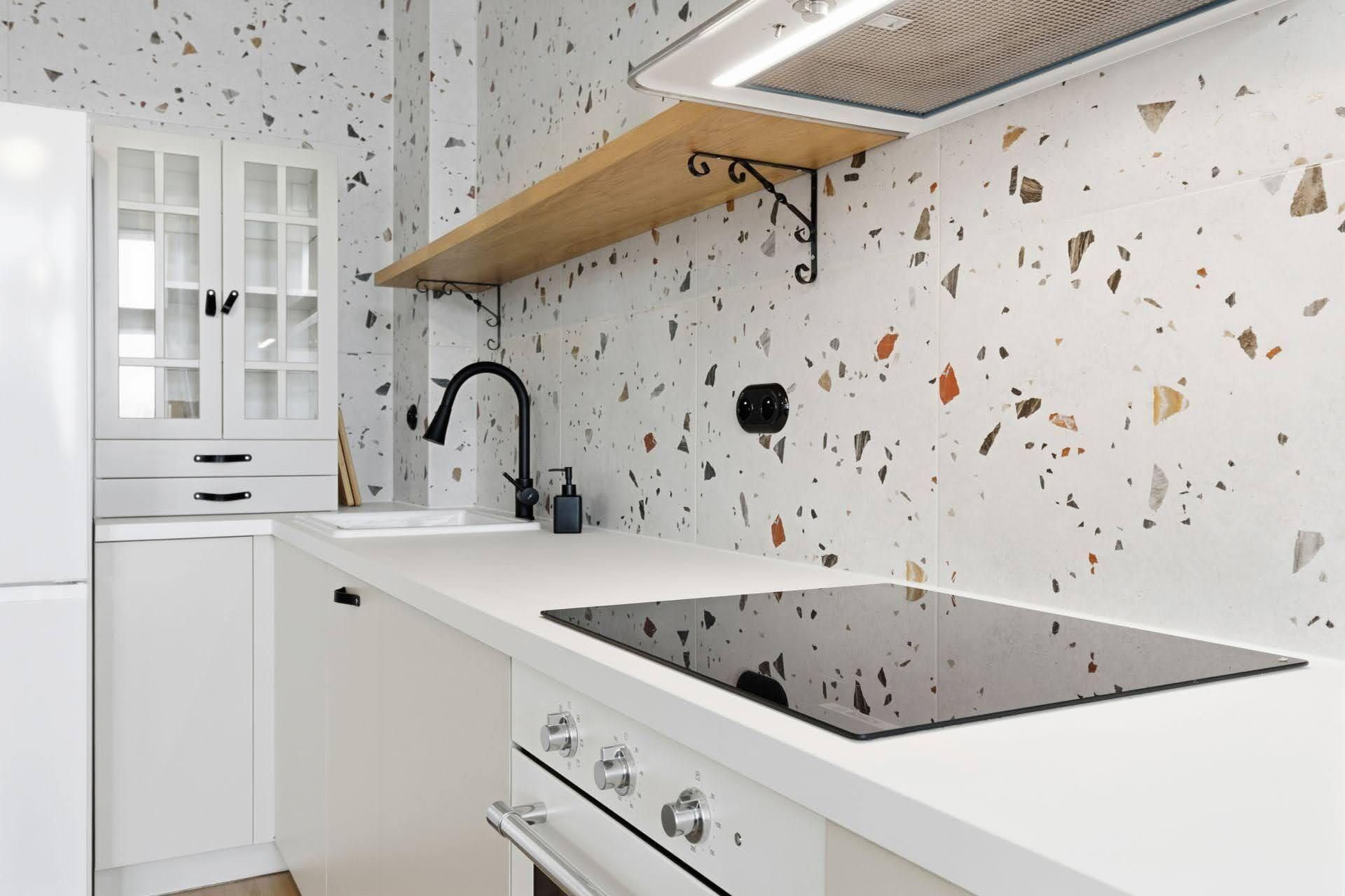 Kuchyňská část je vybavena rohovou linkou se zabudovanou myčkou, troubou a lednicí. V koupelně je sprchovací kout, pračka a bojler na ohřev vody.