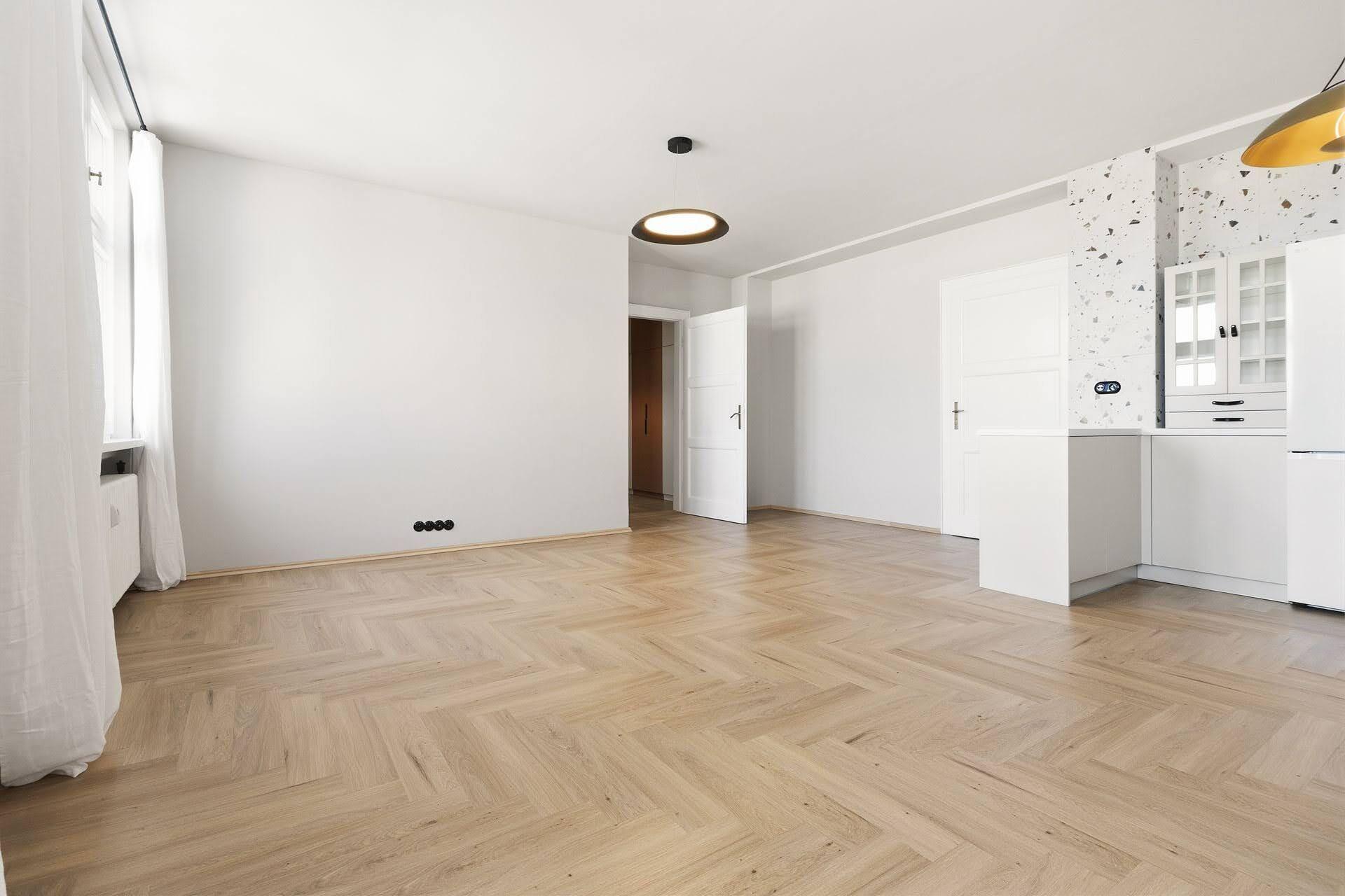 Byt se nachází v pátém, posledním podlaží domu s výtahem, což zajišťuje dostatek klidu i soukromí. Byt je po rekonstrukci a pronajímá se nezařízený, což umožňuje novému nájemci zařídit si interiér podle vlastních představ. Dostatek úložného prostoru zajišťují velké šatní skříně v předsíni.