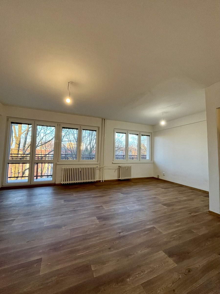 K dlouhodobému podnájmu nabízíme krásný a prosluněný byt o velikosti 3+1 o celkové výměře 74m2 ve čtvrtém patře panelového domu. K bytu náleží také sklep a dva balkony.