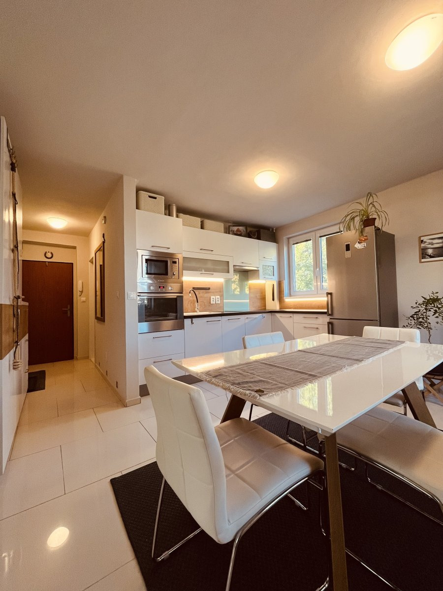 Plně vybavená kuchyně: vestavěné spotřebiče (elektrická trouba, digestoř, sklokeramická deska, myčka, mikrovlnná trouba), volně stojící lednice, jídelní stůl a 4 židle