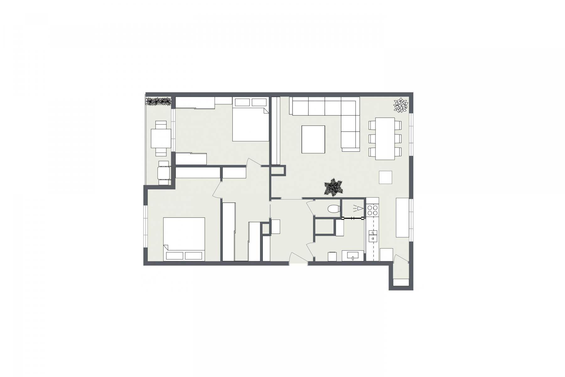 Dispozice je ideální, ať pro rodinu, pár, nebo někoho, kdo má rád prostor kolem sebe. Najdeš tu dva velké neprůchozí pokoje a k tomu velký obývák s kuchyní, kde se vejde ledacos včetně jídelního koutu. Super bonus je místo na šatnu konečně nebudeš lovit mikiny ze židle nebo z rohu ložnice. Když budeš chtít na chvíli vypnout, skočíš na balkon s kávou nebo sklenkou vína a svět zpomalí. S vínem teda stopro.