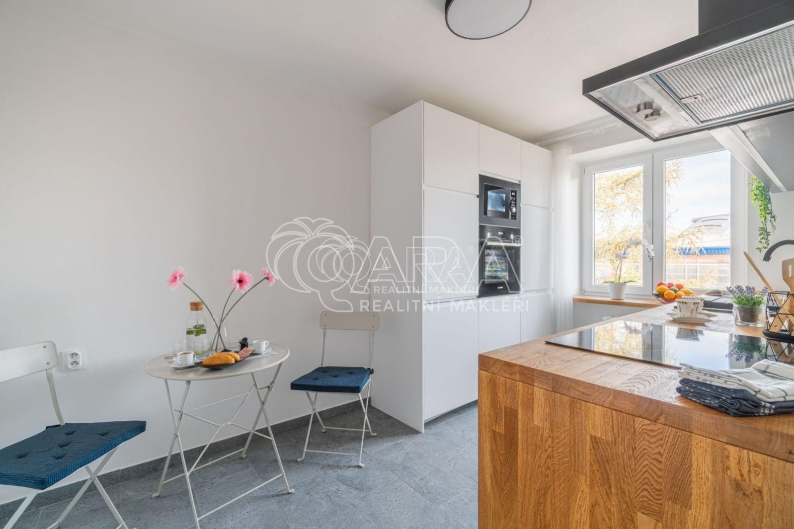 Kuchyně: Moderní linka s masivní deskou a vestavnými spotřebiči (lednice, myčka, trouba, varná deska, mikrovlnka, pračka). Prostor pro jídelní stůl.