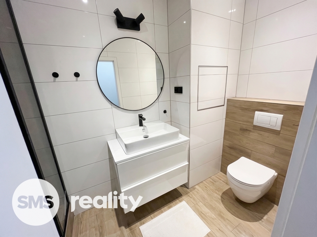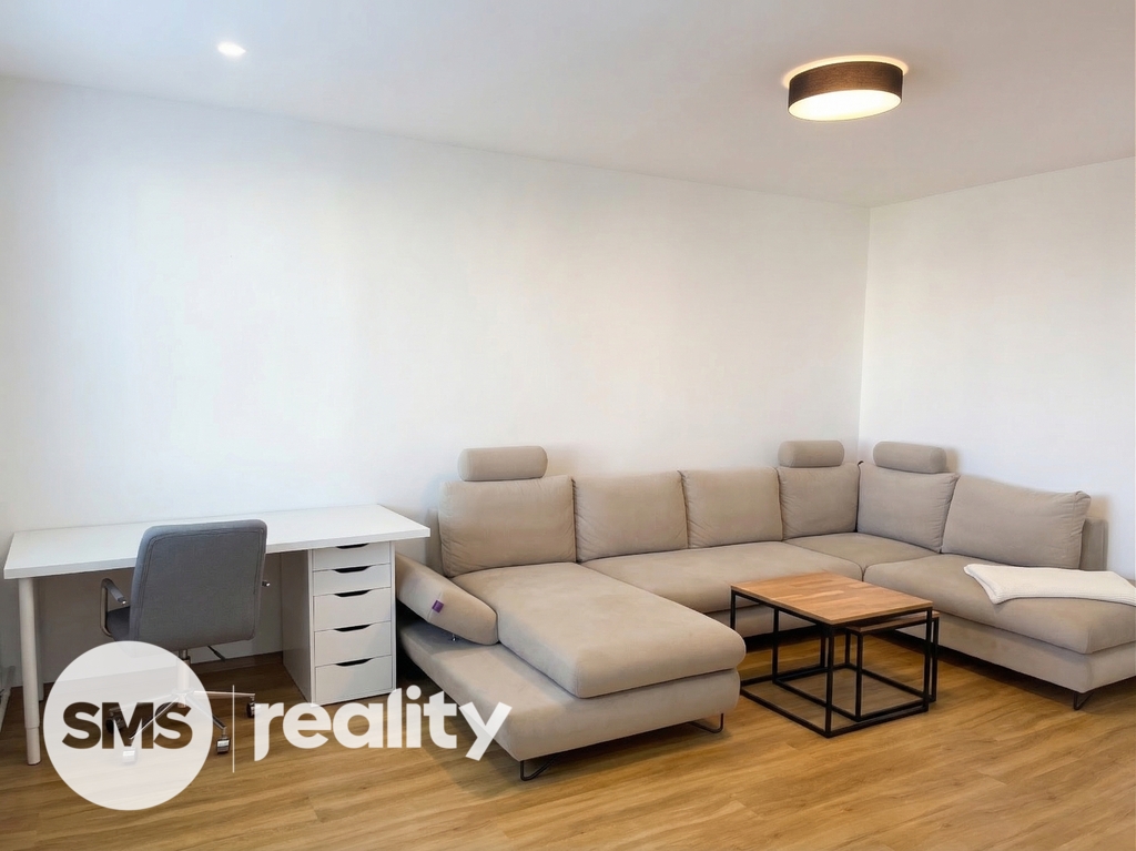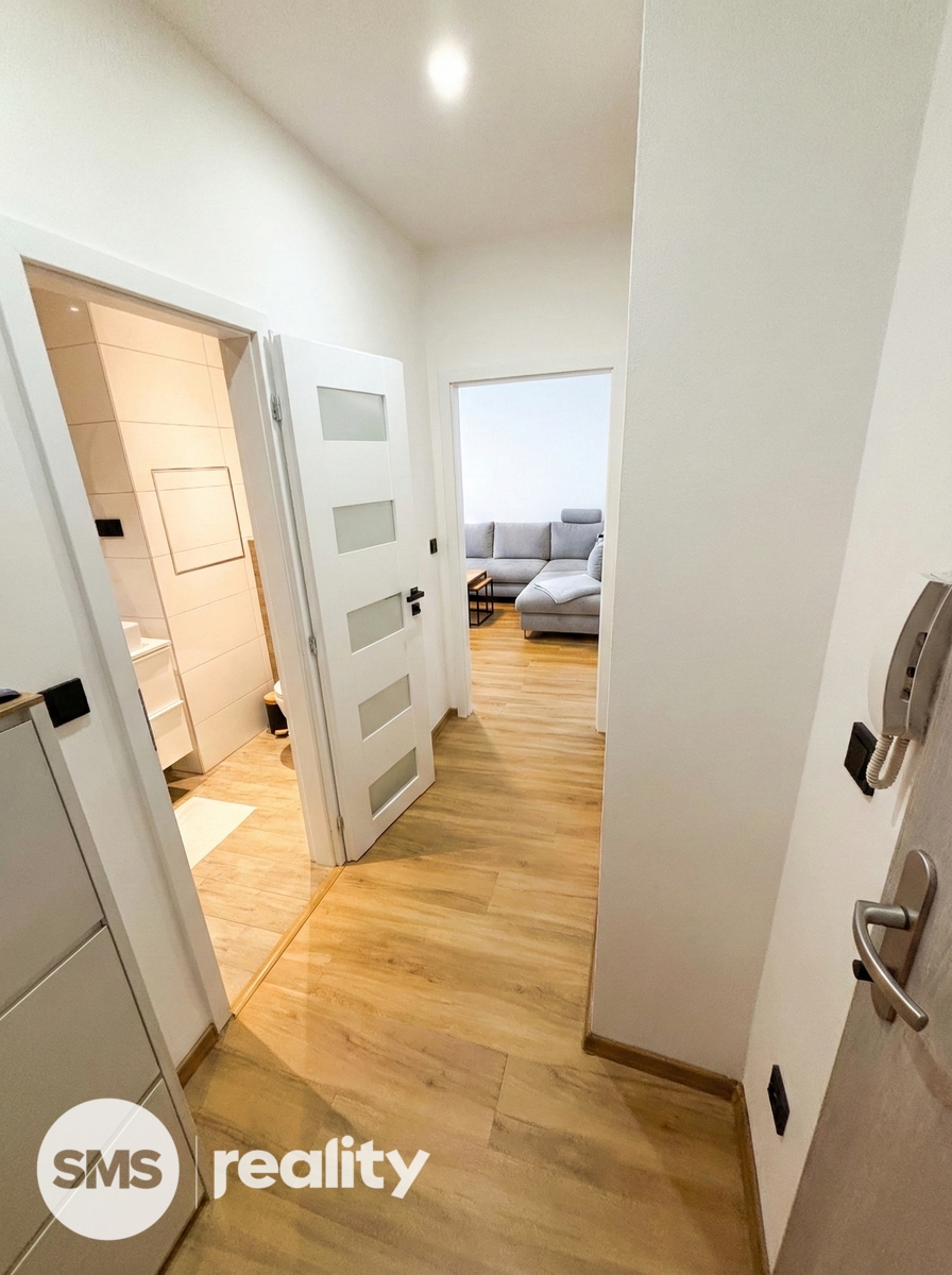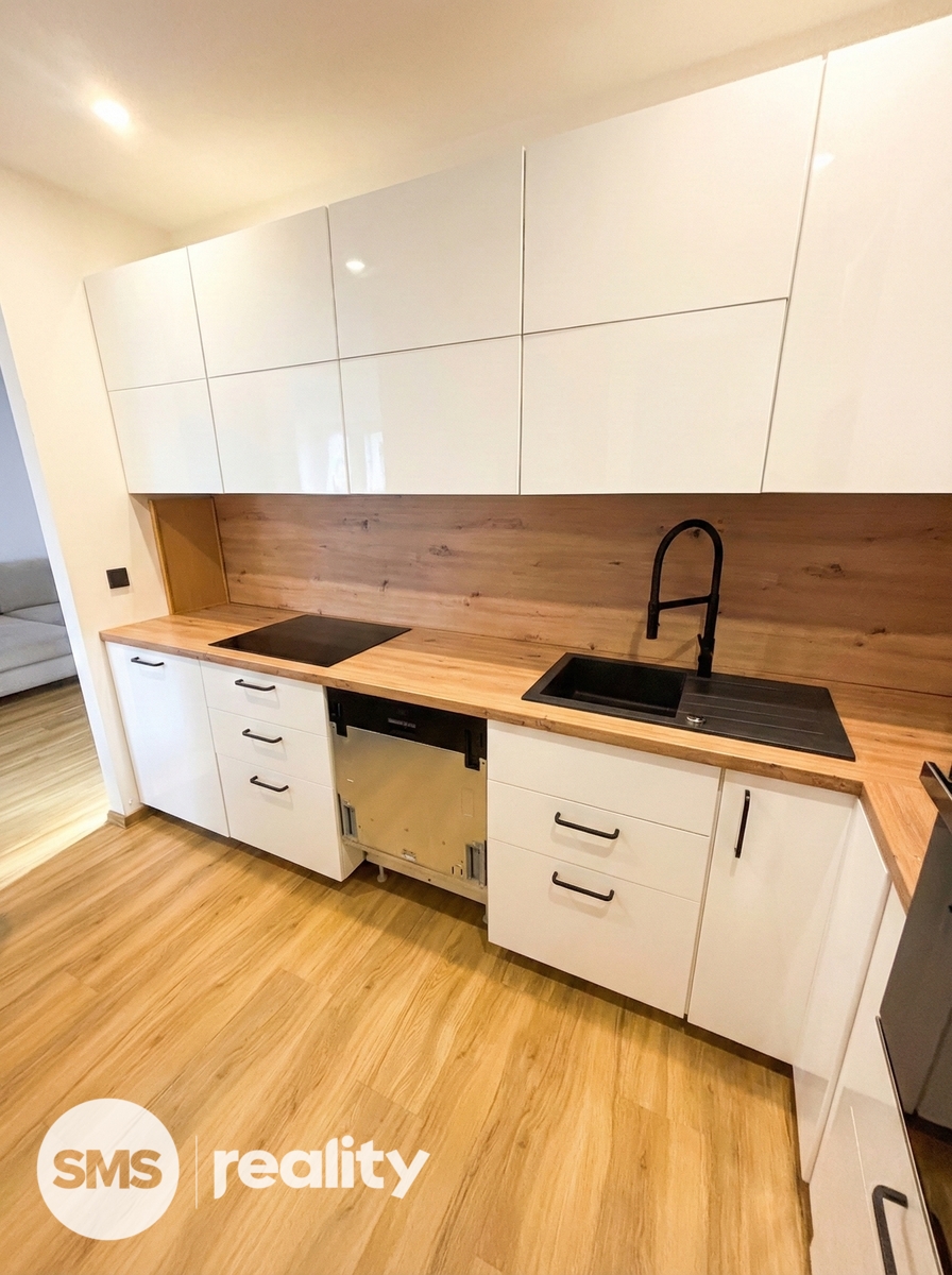 Dispozice bytu je velmi praktická a zahrnuje vstupní chodbu, samostatnou ložnici, obývací pokoj s kuchyňským koutem a koupelnu s toaletou. Obývací část je vybavena prostornou sedací soupravou, konferenčními stolky a TV skříňkou, což vytváří příjemný prostor pro relaxaci i návštěvy. Kuchyňský kout je součástí obývacího pokoje a poskytuje dostatek místa pro každodenní vaření a stolování. Ložnice je zařízena manželskou postelí, nočními stolky a úložnými prostory. Koupelna je moderně řešena se sprchovým koutem, umyvadlem se skříňkou a toaletou, vše v elegantní kombinaci bílé barvy a dřeva.