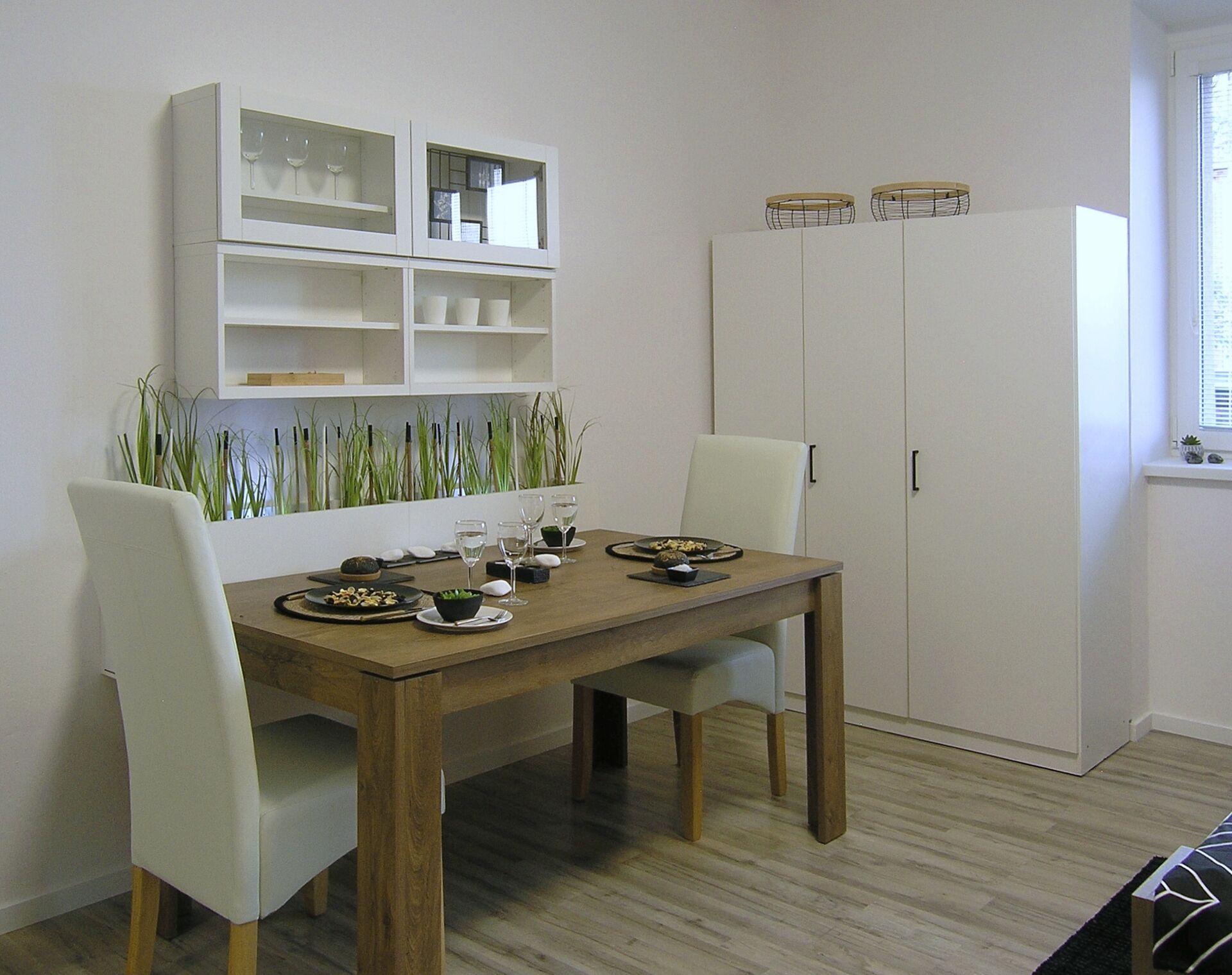V bytě se nachází pocitové LED osvětlení, které vytváří dle individuální volby barevné náladové světelné akcenty. Kuchyně s novou kuchyňskou linkou je vybavena granitovým dřezem s flexibilní stojánkovou baterií, vestavnou lednicí s mrazákem, vestavnou plynovou deskou, horkovzdušnou troubou s více funkcemi, nerezovou digestoří s osvětlením, barovým stolem s židlemi a vestavěnou pračkou se sušičkou. Pokoj má elegantní koženou pohovku, jídelní stůl s židlemi, klidovou část s pohodlnou širokou postelí a další úložné prostory. V bytě se dále nachází prostorná šatna s vestavěnou skříní a policemi.