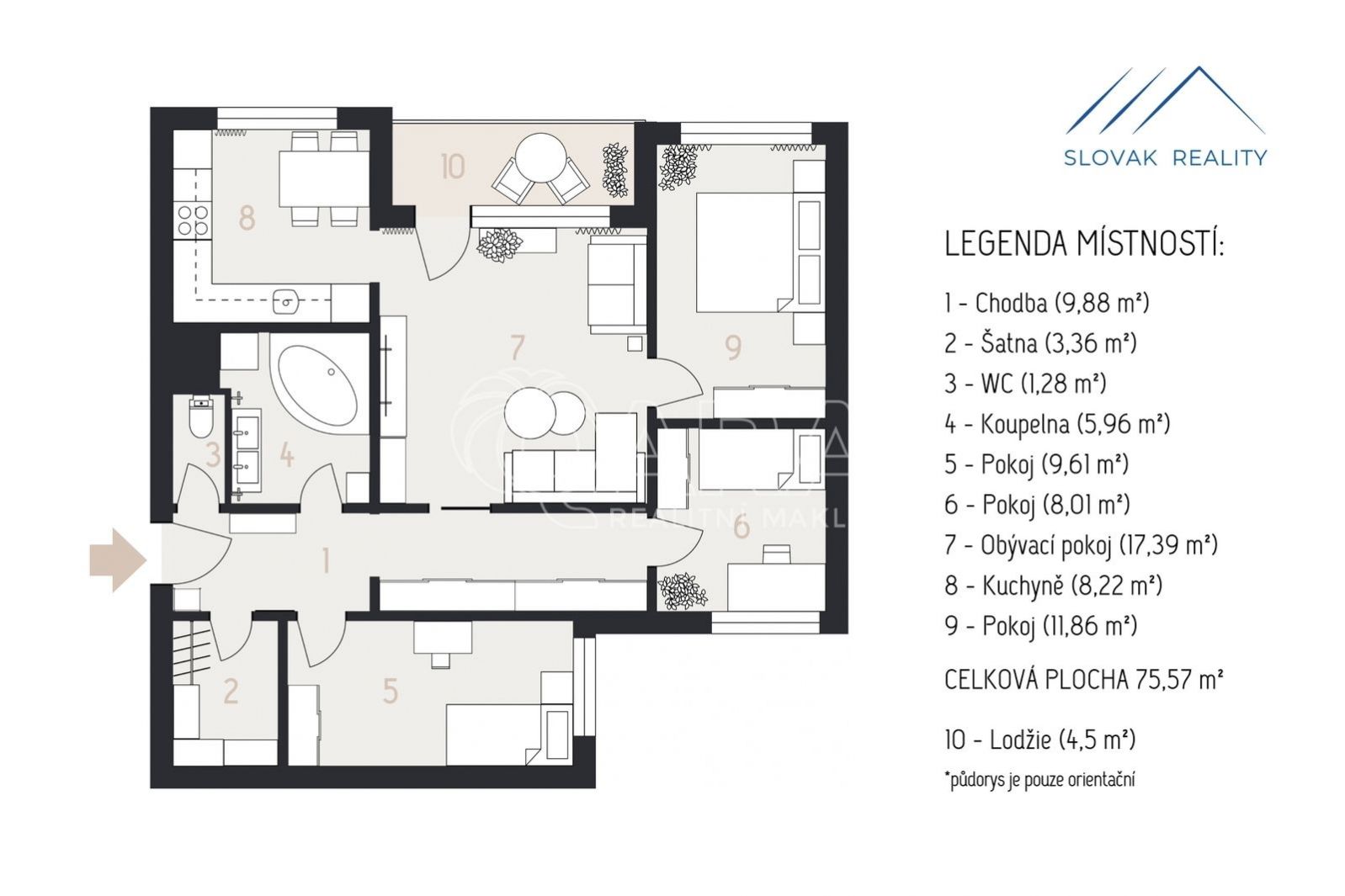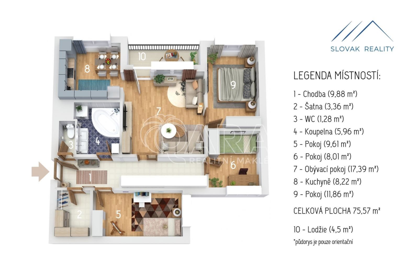 Byt má celkovou užitnou plochu přibližně 80 m včetně lodžie a nabízí dispozici, která dnes není běžná. Čtyři samostatné pokoje poskytují dostatek prostoru pro rodinné bydlení i pro dlouhodobý pronájem. Orientace na jihozápad zajišťuje dostatek denního světla a příjemné výhledy do okolní krajiny i ze druhého patra domu.