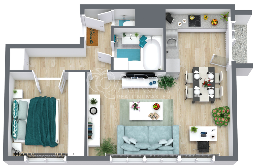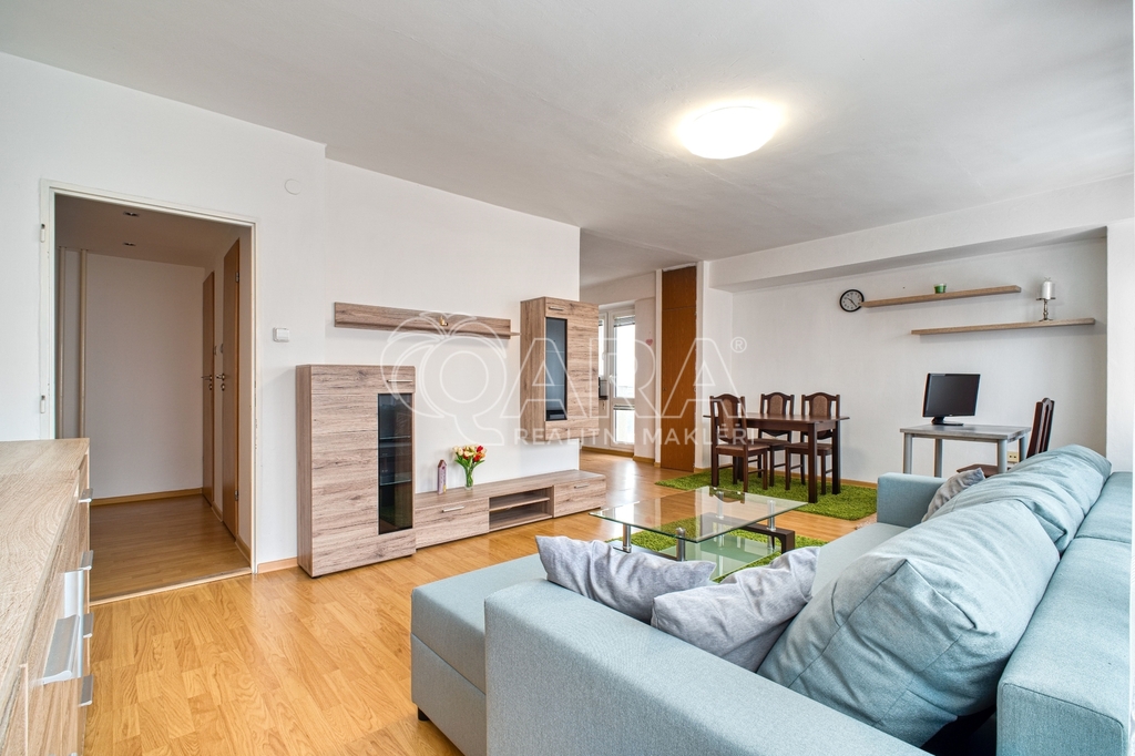 Byt je světlý, vzdušný a velmi prakticky řešený – samostatná ložnice, prostorný obývací pokoj s kuchyňským koutem, jídelní částí i pracovním místem vytváří ideální zázemí pro pár, jednotlivce pracující z domu nebo manažerské bydlení.