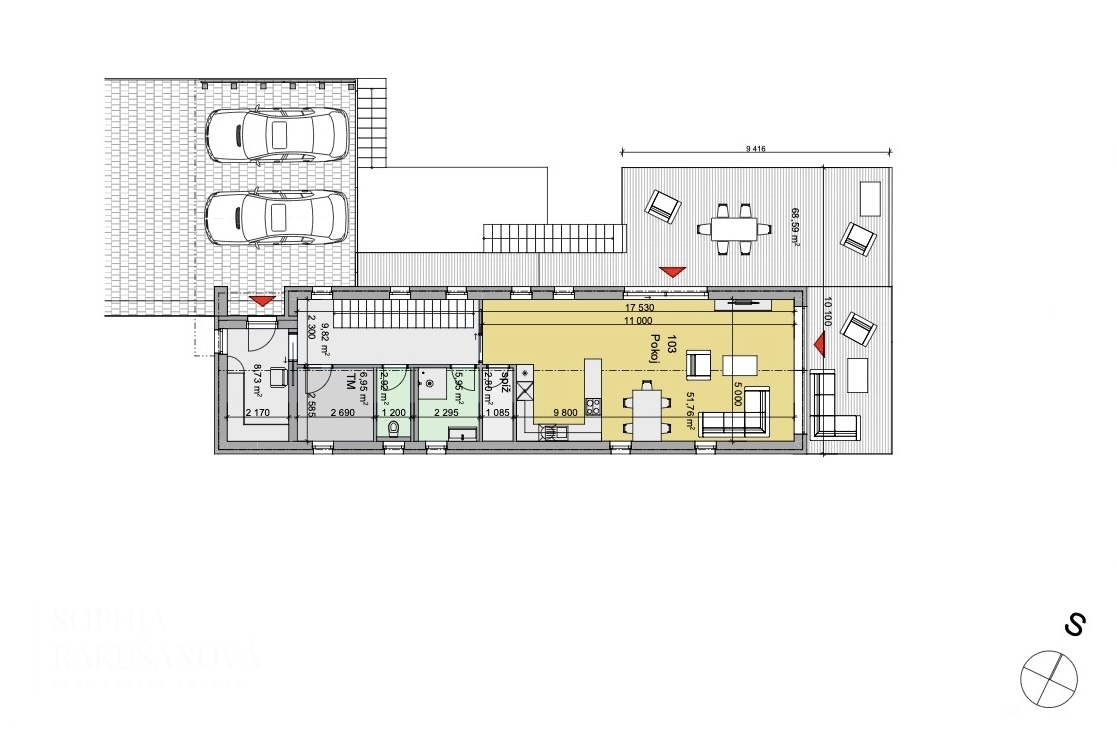 Dům je navržen s užitnou plochou 205 m² bez teras, přičemž celková plocha včetně velkorysých teras činí 347 m². Dispozice 4+kk nabízí dostatek prostoru a soukromí pro celou rodinu, a zároveň vytváří otevřené a přirozené centrum domu pro společné chvíle.