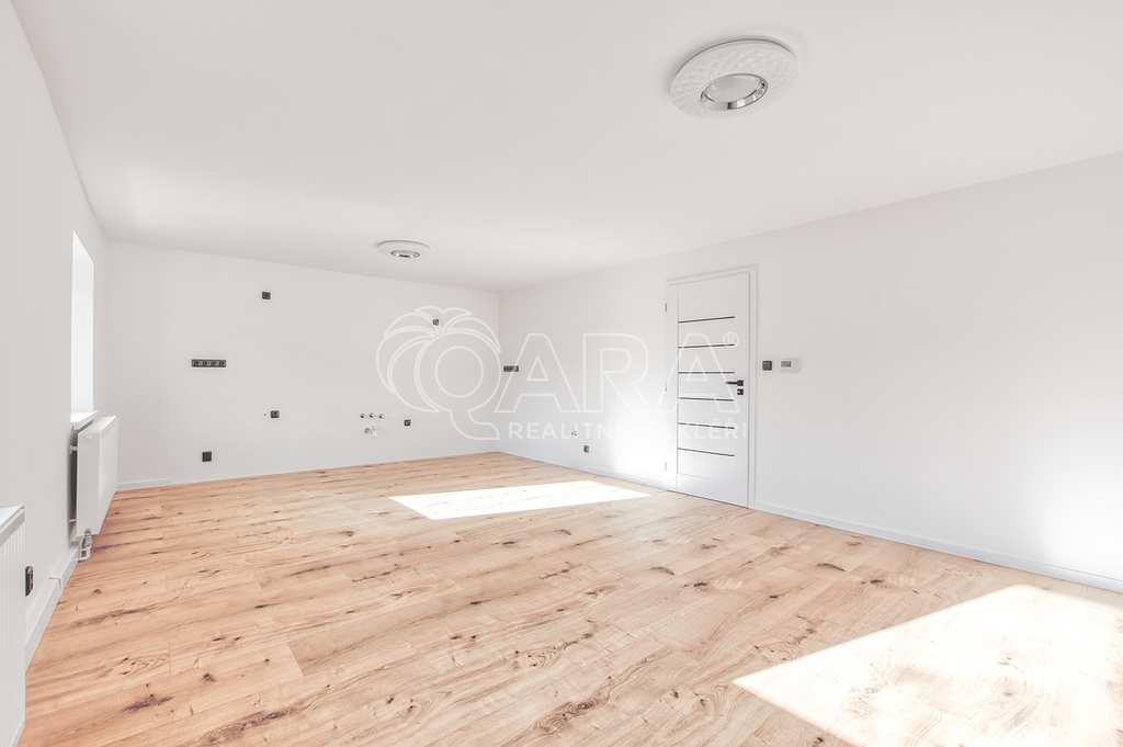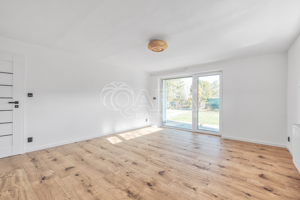 Přízemí domu nabízí vše potřebné pro pohodlný život. Nachází se zde prostorná koupelna se sprchovým koutem, která je vybavena elektrickým podlahovým topením. Dále zde najdete ložnici s francouzským oknem a venkovními roletami, která může sloužit i jako pracovna. Hlavní obytný prostor tvoří obývací pokoj propojený s kuchyní, kde jsou již připraveny přípojky pro spotřebiče. V přízemí se nachází také technická místnost s tepelným čerpadlem a 280l bojlerem a praktická letní kuchyně, ze které se vchází přímo na krytou terasu o velikosti 21 m².