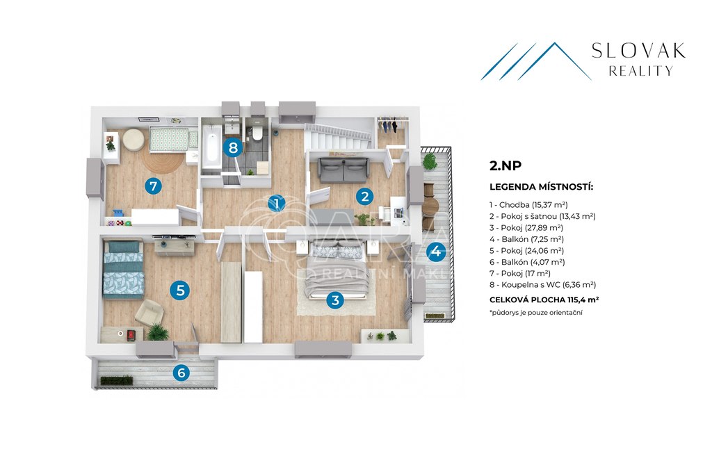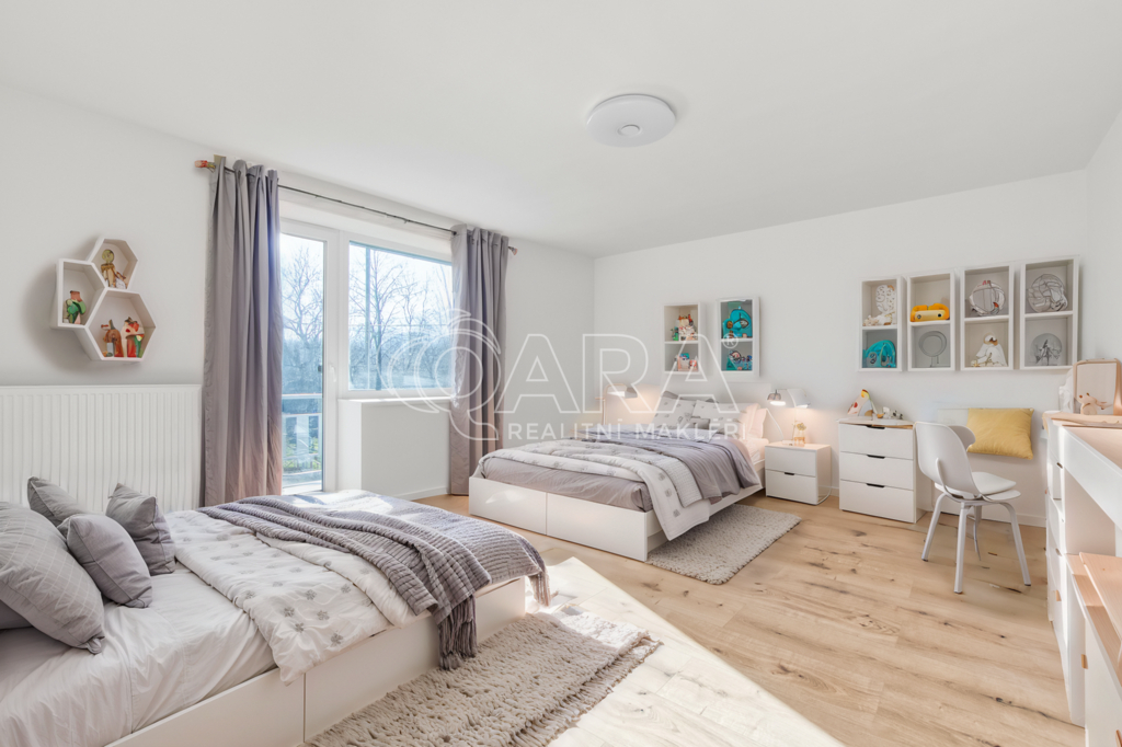 V patře se nachází čtyři velké, světlé pokoje. Každý z nich nabízí dostatek prostoru a lze je využít jako ložnice, dětské pokoje nebo pracovny. Součástí patra je také koupelna s vanou a toaletou. Dva z pokojů mají vlastní balkon, jeden orientovaný na východ, druhý na jih, což umožňuje krásné výhledy na okolní krajinu.