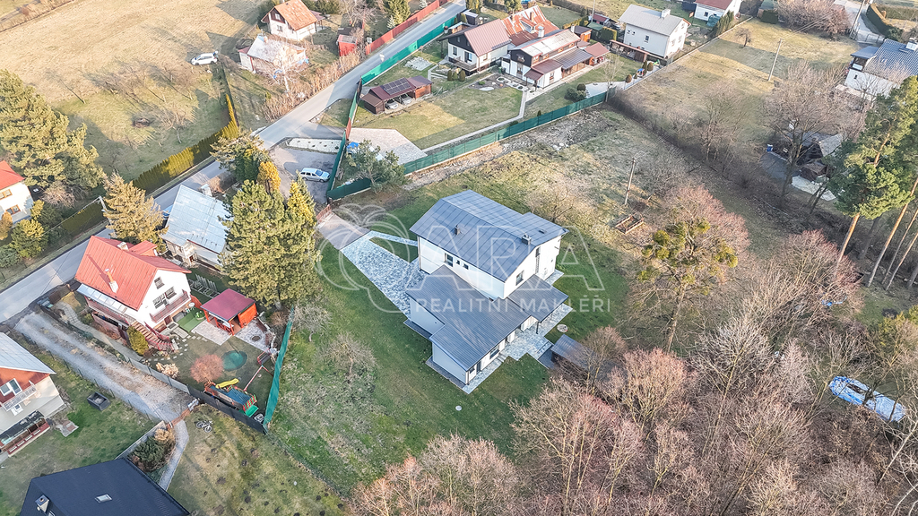 Dvoupodlažní dům stojí na rovinatém a slunném pozemku o rozloze 1 891 m², který poskytuje nejen dostatek soukromí, ale i prostor pro relaxaci, zahradničení či rodinné zázemí.