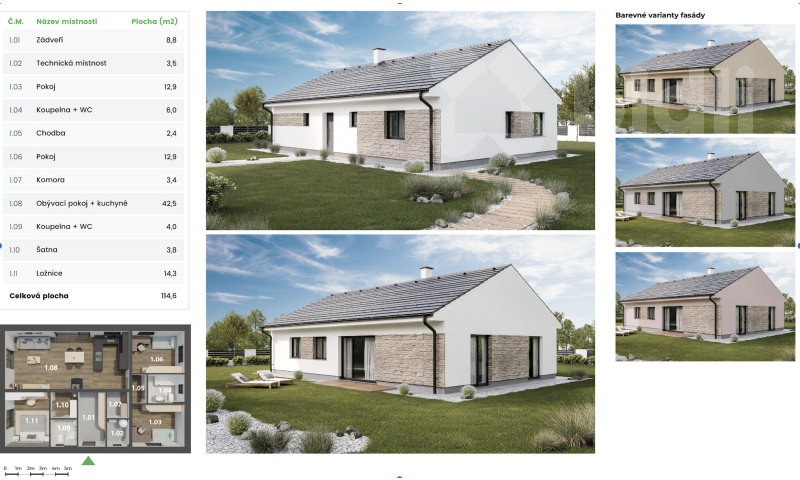 Dům bude realizován ve vysokém standardu - vinylové podlahy, moderní sanita (SAT, SIKO), plastová okna s izolačním trojsklem, antracitová střešní krytina, interiérové dveře, elegantní obklady Rako Betonico, příprava pro kuchyňskou linku a vybavené koupelny. O vytápění se postará tepelné čerpadlo typu vzduch-voda od značky Willy, což znamená nízké provozní náklady a energetickou efektivitu. Změny v dispozičním řešení i standardech jsou možné - dům lze přizpůsobit vašim přáním ještě před dokončením.