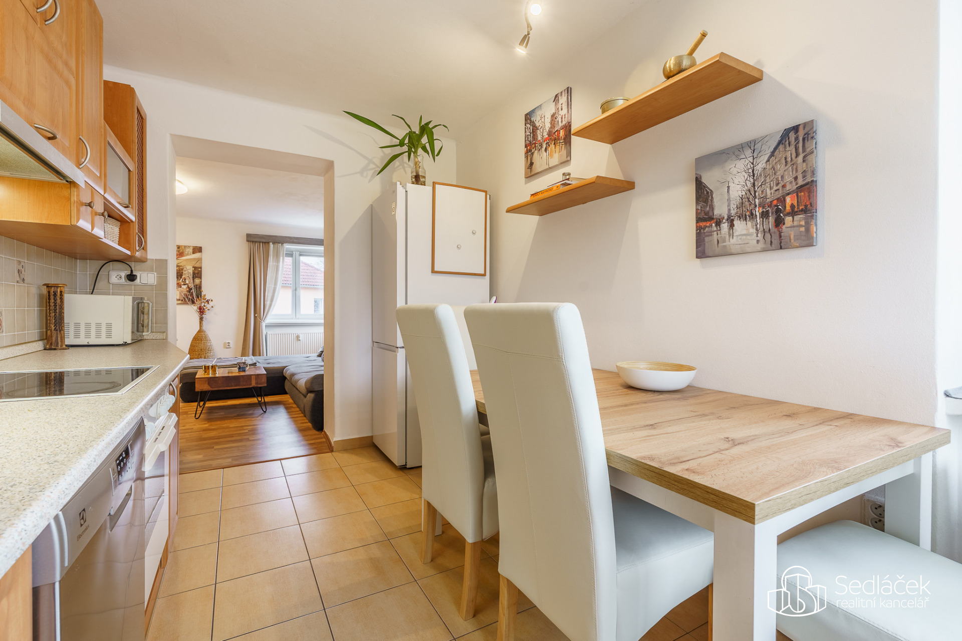 Dispozice bytu nabízí samostatnou ložnici, prostorný obývací pokoj a samostatnou kuchyni s moderní kuchyňskou linkou. Praktické uspořádání jednotlivých místností poskytuje dostatek prostoru pro pohodlné bydlení i případné úpravy dle vlastních představ.