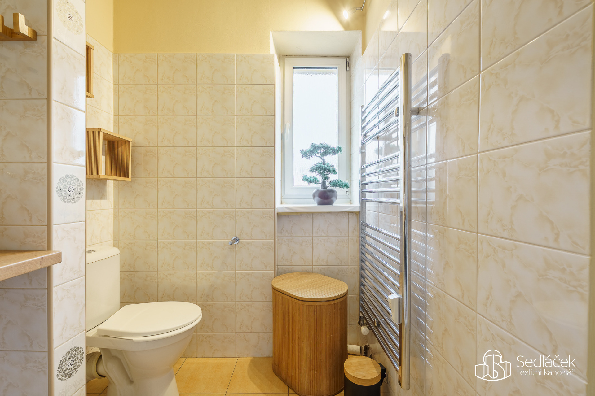 Byt disponuje prostornou koupelnou s vanou, toaletou a oknem, které zajišťuje přirozené větrání a denní světlo. Součástí je také velkorysá vstupní chodba s oknem, která nabízí dostatek úložného prostoru.