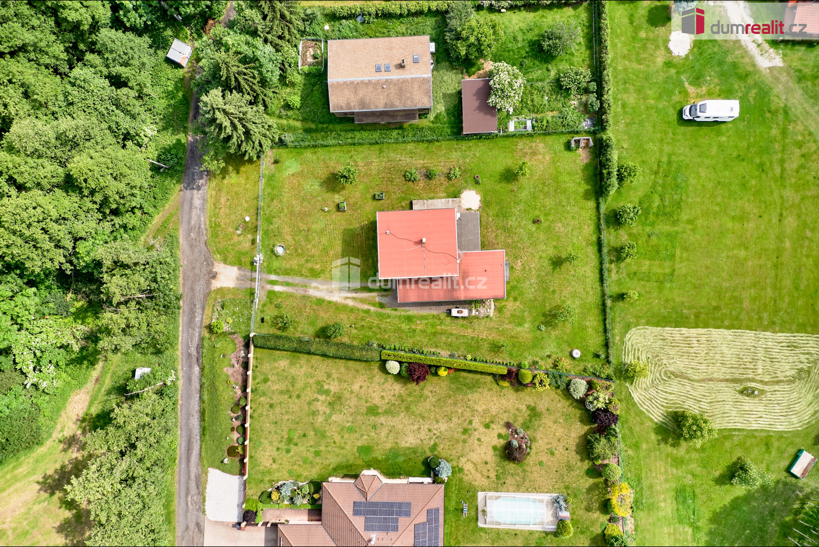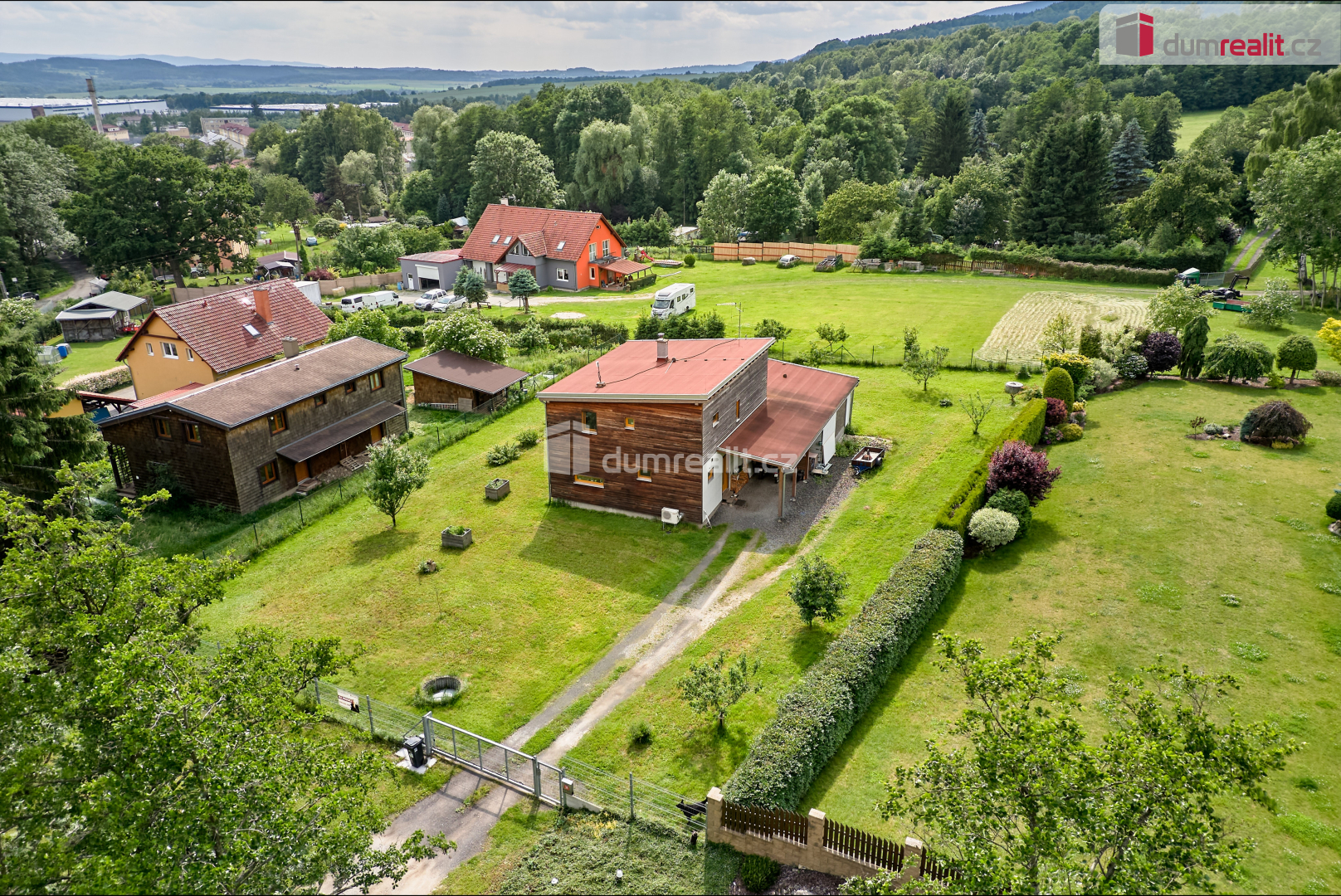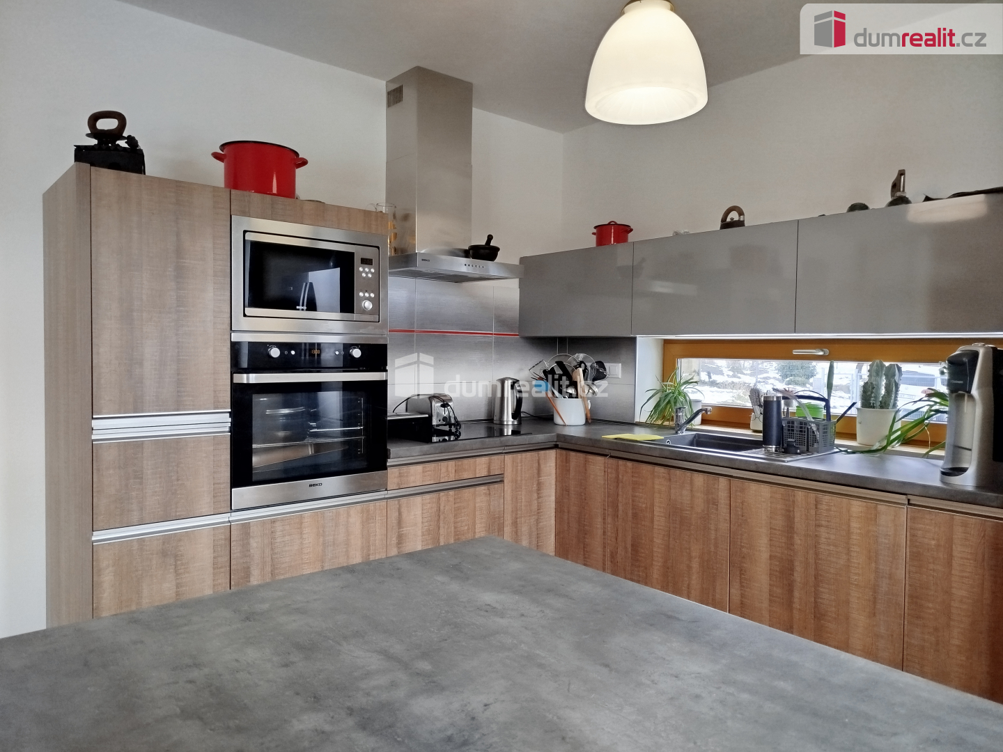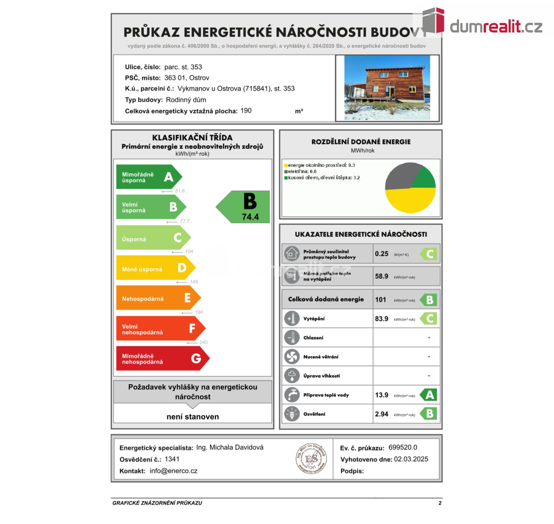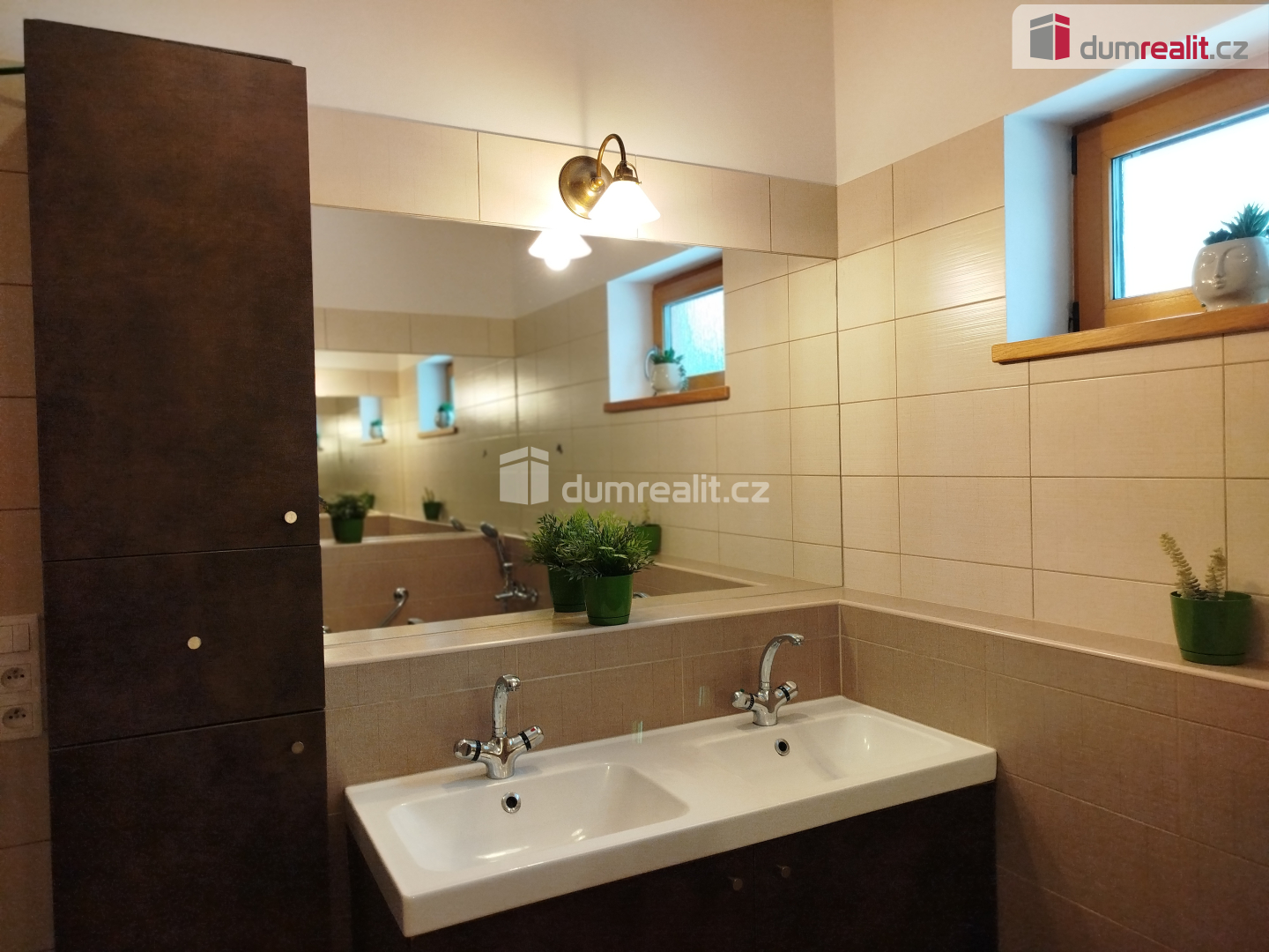 Naše společnost Vám zprostředkuje prodej dvoupodlažního rodinného domu (dřevostavby) v podkrušnohorském městě Ostrov, místní části Vykmanov, 15 km od Karlových Varů. Dům o velikosti 5+kk (zast. plocha cca 134 m², podlahová plocha domu cca 156 m², podlahová plocha dílny cca 42 m²) je postaven na rovinatém pozemku o výměře 1.746 m² a jeho orientace umožňuje sluneční svit od východu po západ. Hlavní stavba je spojena s dílnou, která má samostatné vstupy a vjezd a lze ji využít také jako garáž. V přízemí je vstup do domu se zádveřím, chodbou a schodištěm do patra, technická místnost, koupelna s WC, pokoj, kuchyňský kout s jídelnou a obývací pokoj s krbovými kamny. Z obývacího pokoje lze vyjít přímo na venkovní dřevěnou terasu, která je v západní části zastřešena. Hlavní vstup do domu je chráněn zastřešenou přístavbou. V 1. NP je chodba, samostatná koupelna, samostatné WC, komora a tři pokoje, z nichž dva jsou oddělené dřevěnými posuvnými dveřmi, takže se dají propojit v jeden velký. Veškerá okna v celém objektu jsou plastová s trojskly, v horním patře mají některá okna venkovní mechanické žaluzie. Součástí vybavení domu je technologické zázemí (tepelné čerpadlo, bojler) a kuchyňská linka se spotřebiči (indukční deska, el. trouba, vestavěná mikrovlnná trouba, myčka, digestoř). Vytápění domu a ohřev teplé vody je zajištěn tepelným čerpadlem, podlahové topení je v celém přízemí (včetně dílny) a všech koupelnách a WC. V obytných pokojích jsou radiátory. Druhým zdrojem tepla jsou krbová kamna v obývacím pokoji. Dodávka studené vody je z veřejného vodovodního řádu, kanalizace je napojena do domovní čistírny odpadních vod (DČOV). V současné době probíhají přípravy k realizaci napojení do obecního veřejného kanalizačního řádu a rekonstrukce příjezdové komunikace. Na zahradě je vlastní studna pro zalévání zahrady. Parkování je možné na pozemku nebo před vjezdem k domu. Stavba je nízkoenergetická a dle platné legislativy je zařazena do energetické třídy B. Tuto nemovitost lze hradit hypotečním úvěrem, který Vám rádi pomůžeme vyřídit. Ev. číslo: 650263.