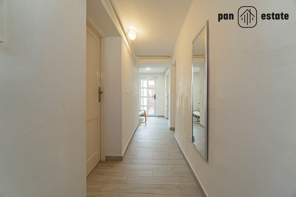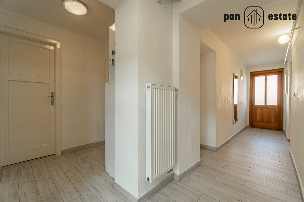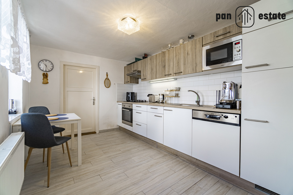 Přízemí domu prošlo kompletní rekonstrukcí. Byly provedeny nové podlahy, omítky, rozvody, nová kuchyně, koupelna i podlahové vytápění. Dispozičně dům nabízí ze vstupu dlouhou halu, pokoj, obývací pokoj, samostatnou kuchyni, praktickou spíž vedle kuchyně, koupelnu se sprchovým koutem a WC a další pokoj přístupný ze zahrady, který je možné upravit na plnohodnotný obytný pokoj, pracovnu nebo pokoj pro hosty.