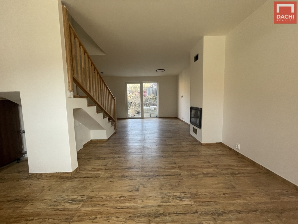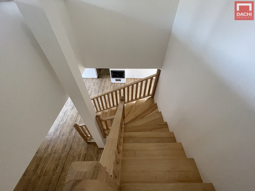Dispozice 5+kk poskytuje dostatek prostoru pro rodinné bydlení i práci z domova. Přízemí o výměře 66 m² je prakticky řešeno – nachází se zde koupelna se sprchovým koutem a umyvadlem, samostatné WC se splachovacím systémem Geberit, technická místnost a pokoj vhodný jako pracovna či pokoj pro hosty. Hlavní obytný prostor tvoří obývací pokoj propojený s kuchyňským koutem, kde dominuje krb s teplovzdušným rozvodem. Odtud vede do podkroví schodiště s kovovou nosnou konstrukcí a dřevěnými stupni.