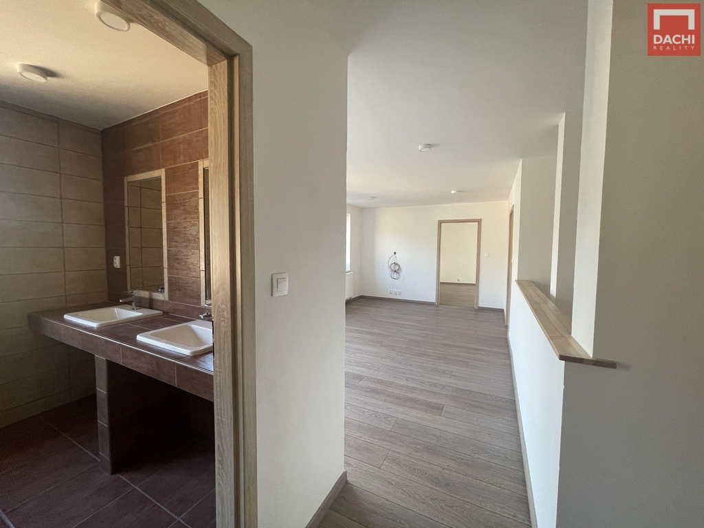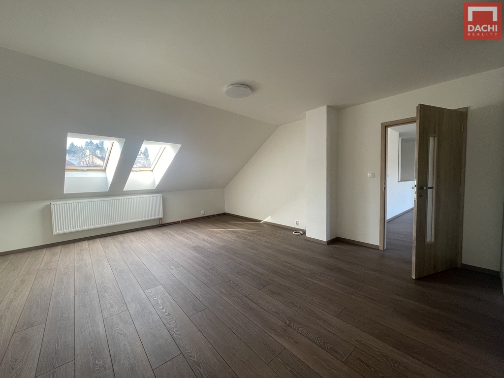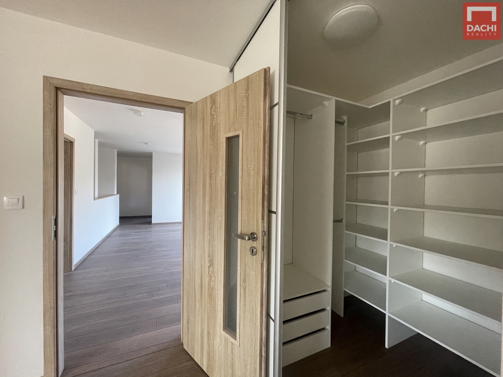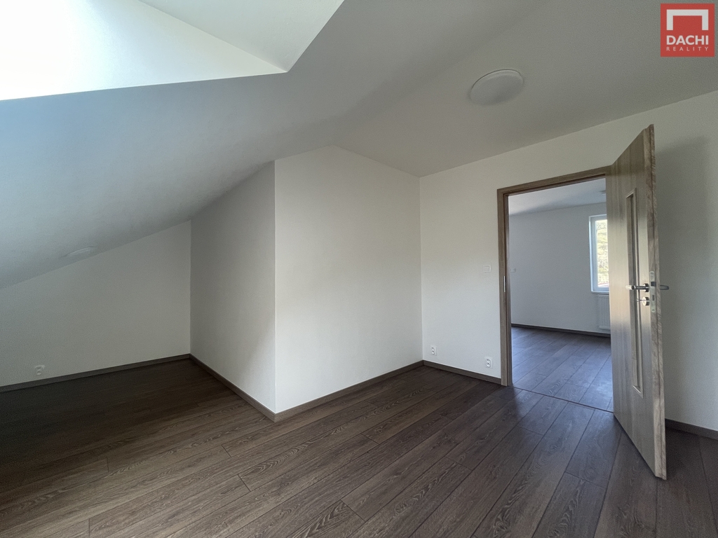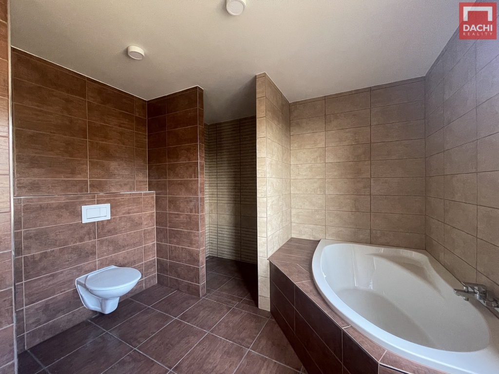 Podkroví o výměře 78,87 m² nabízí tři samostatné pokoje s možností úpravy na čtvrtý. Prostorná koupelna je vybavena vanou, sprchovým koutem a dvěma umyvadly s podlahovým roštem napojeným na vytápění pro příjemný tepelný komfort. Samozřejmostí je druhé WC.