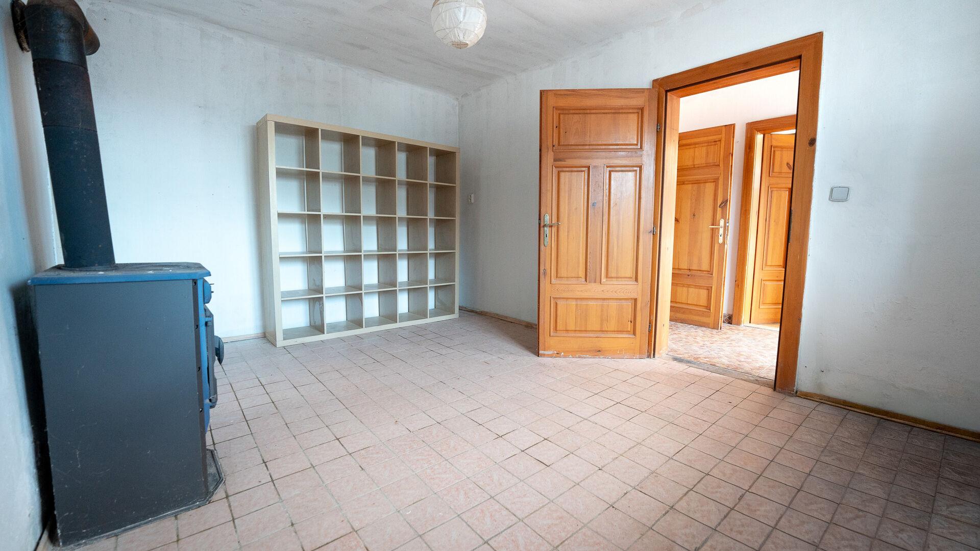 Srdcem domu je prostorný obývací pokoj s krásnými kachlovými kamny, která vytvářejí jedinečnou atmosféru. Společně s kuchyní a dalšími dvěma pokoji je tato část domu plně obyvatelná. Na podlahách jsou dřevěné podlahy, které interiéru dodávají teplo a útulnost.