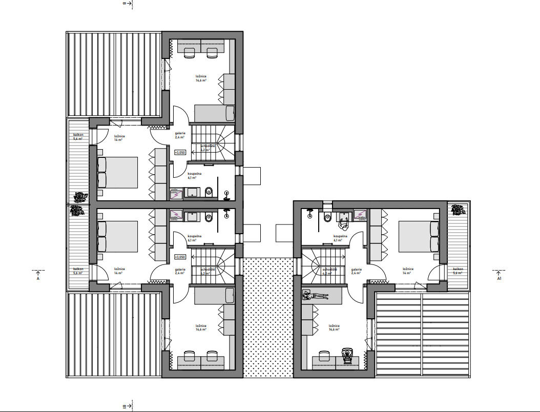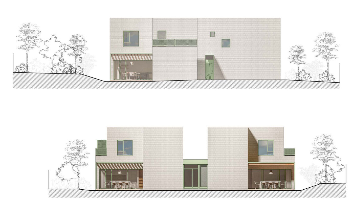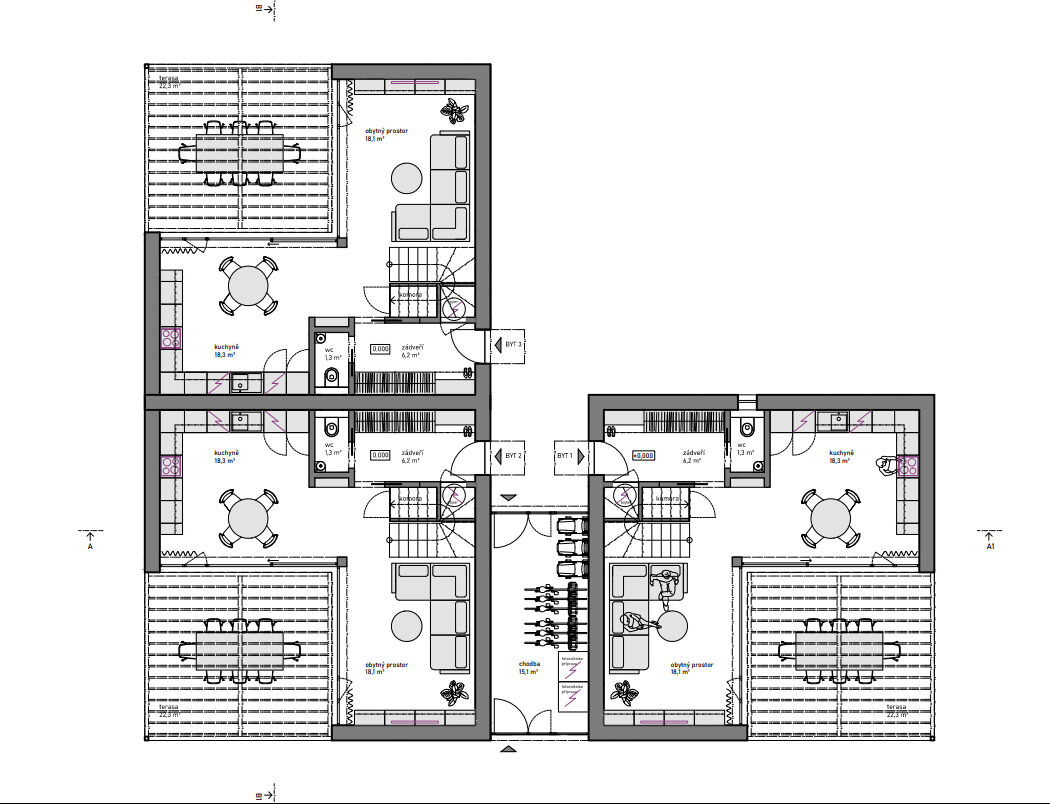 Je připravená studie na vila dům s třemi bytovými jednotkami o výměře 83,3m2. Dům je složen ze tří totožných částí do tvaru křížku, který pozemek člení do čtyř zón-vznikají tak tři soukromé zóny zahrady a společný předprostor domu pro parkování. Každá ze tří částí domu bude samostatnou jednotkou nabízející domov v těsném sepětí se zahradou. V přízemí je vždy obytný prostor s kuchyní a jídelnou otevřený velkými okny na terasu a do přilehlé soukromé zóny zahrady. V patře je pak klidná část s ložnicemi a koupelnou. Výhledy z ložnic jsou vždy do vlastní zahrady. V jižní části pozemku je malé dětské hřiště sloužící společně všem obyvatelům domu.Hřiště je přístupné společnou chodbou, vloženou do středu křížku, s možností uskladnění kol a kočárků.
