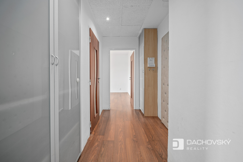 Dispozice 2+kk nabízí praktické uspořádání prostoru. Byt je obyvatelný, nicméně nový majitel musí počítat s postupnou modernizací interiéru. Zejména podlahové krytiny, kuchyňská linka a část technického zázemí již neodpovídají současným standardům a do budoucna si vyžádají úpravy.