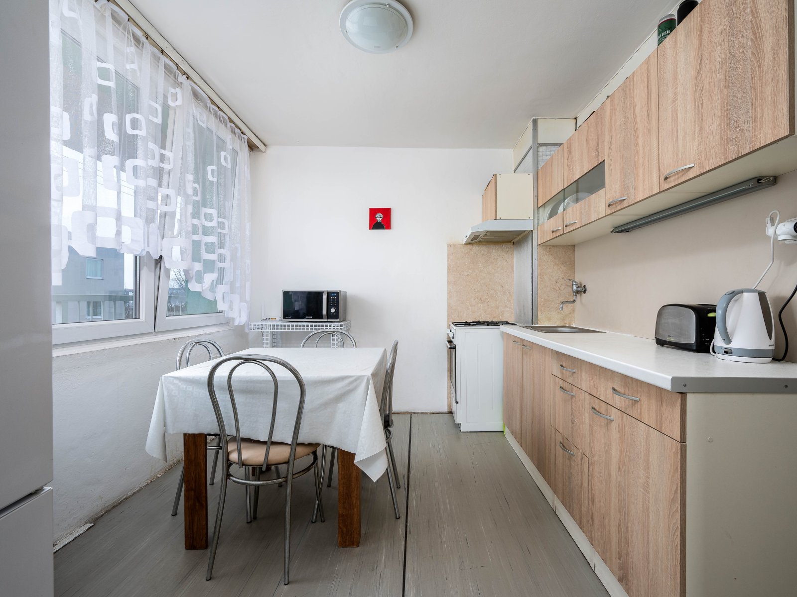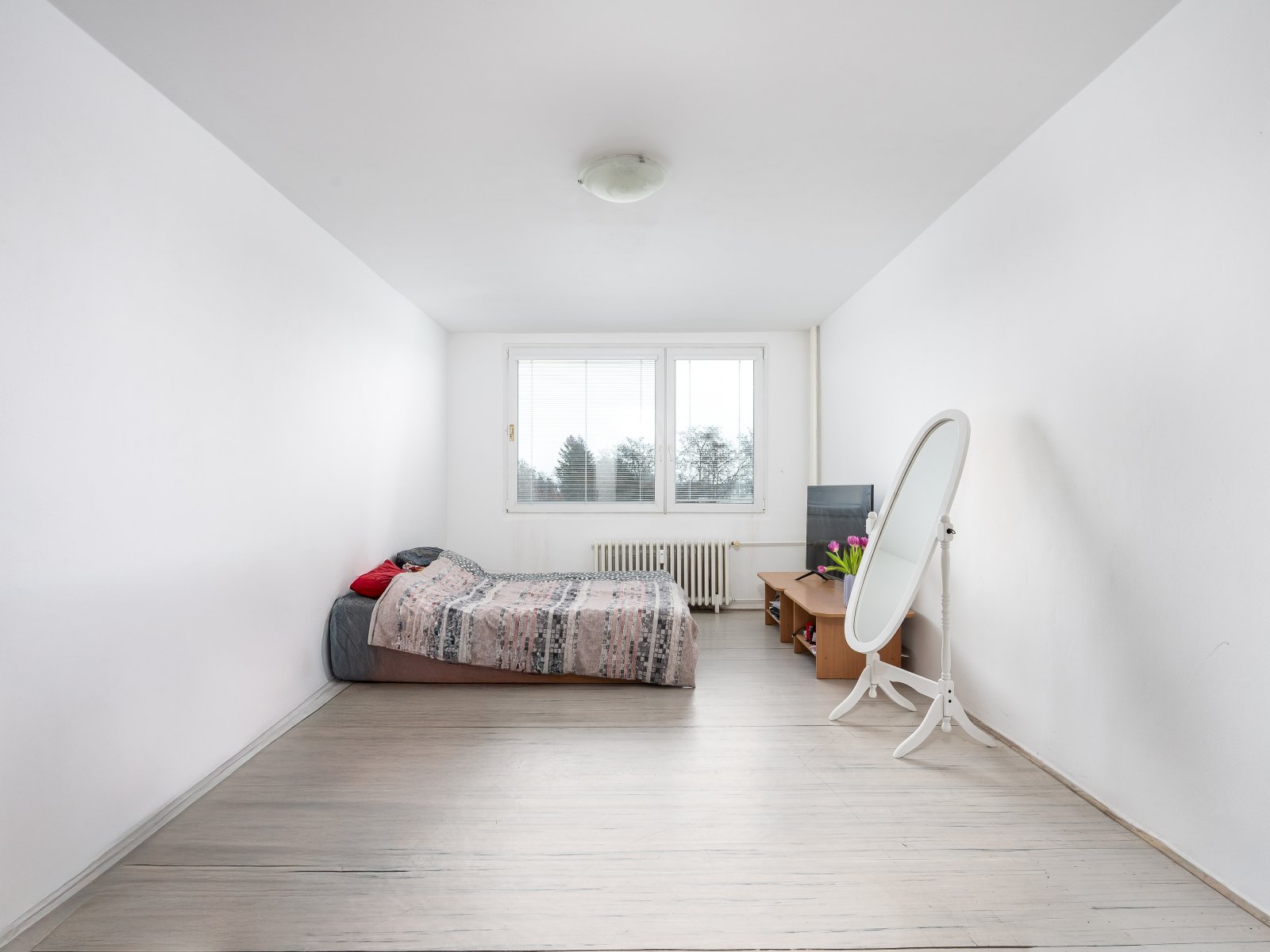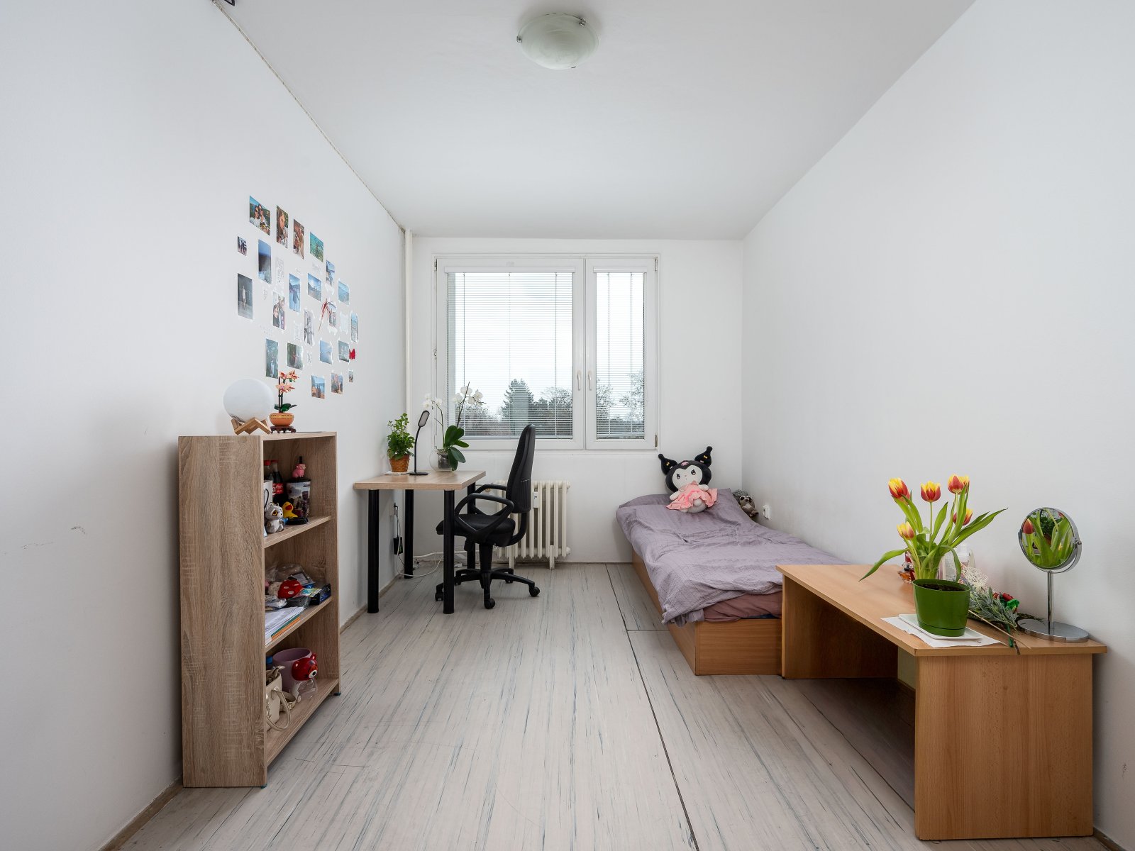 Dispozice bytu je velmi praktická. Z prostorné vstupní chodby jsou přístupné dva samostatné pokoje, dále kuchyně a obývací pokoj, který je rovněž oddělený. Z jednoho z pokojů je přímý vstup na prostornou lodžii, na kterou je orientováno také okno kuchyně, čímž vzniká příjemně propojený a světlý prostor.