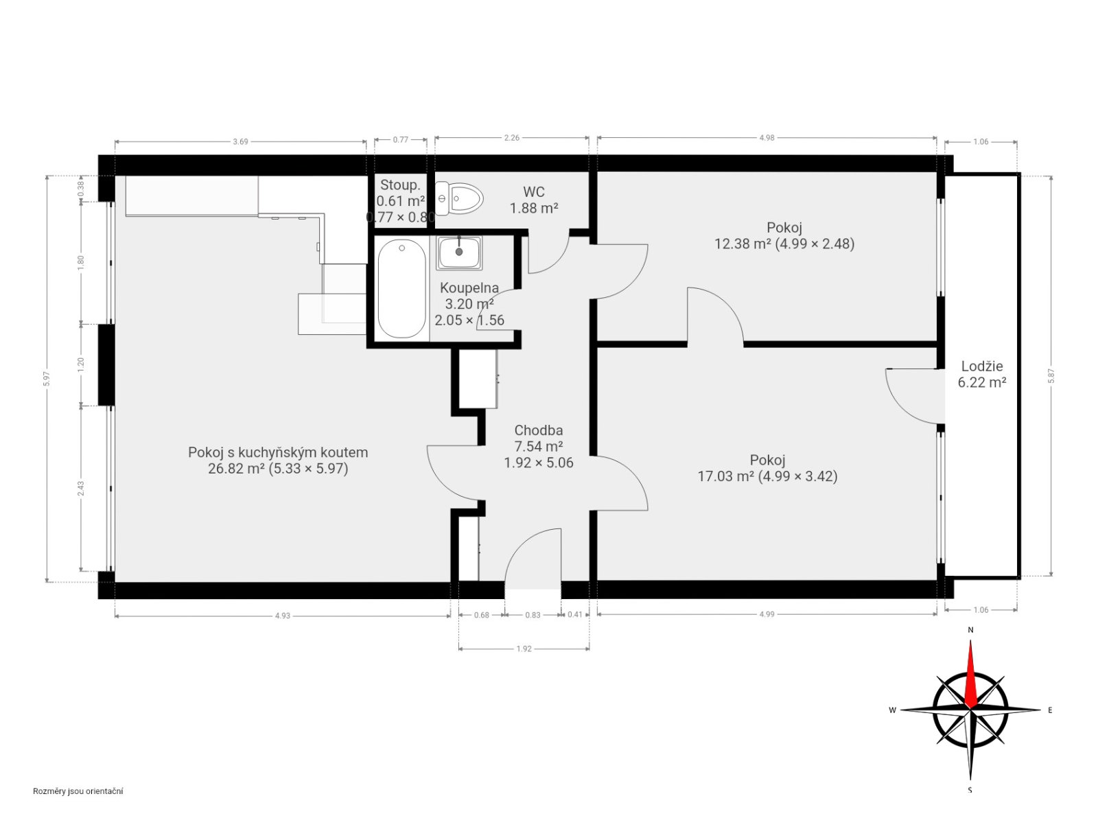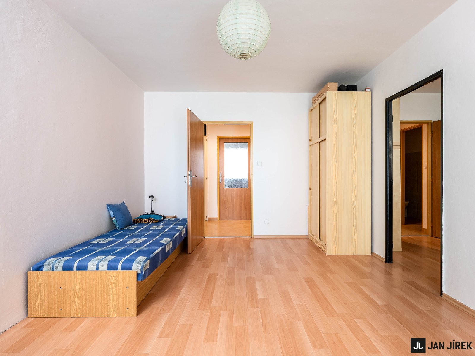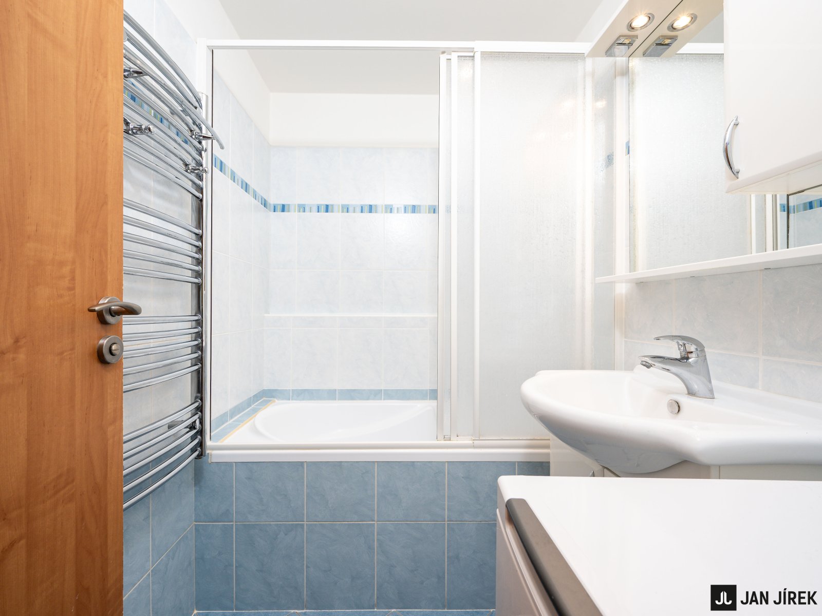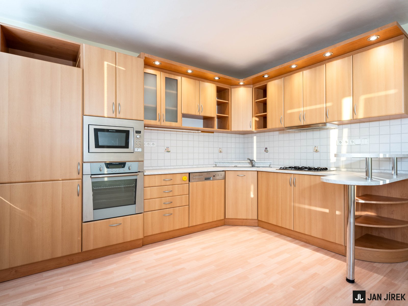 Po levé straně chodby se nachází obývací pokoj s kuchyní na míru, která je vybavena vestavnými spotřebiči (lednice s mrazákem,mikrovlnná trouba, myčka, elektrická trouba, plynová varná deska, digestoř). Po pravé straně chodby najdete dva pokoje, přičemž z jednoho z nich je vstup na prostornou lodžii o ploše 7 m². Na konci chodby se nachází oddělené WC a koupelna s vanou. Byt je zabezpečen bezpečnostními dveřmi.