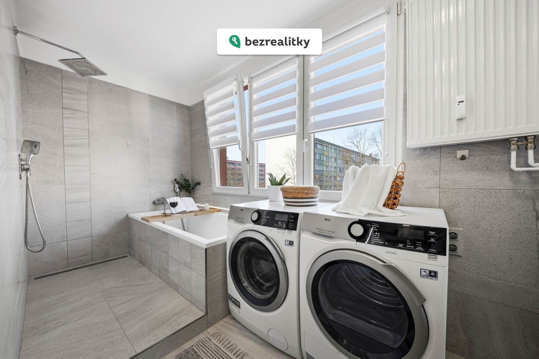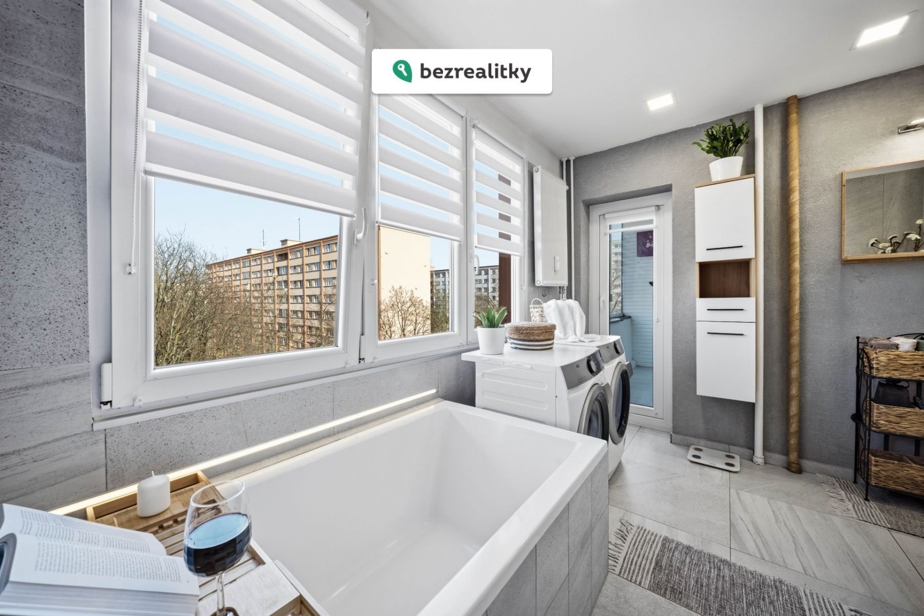 Unikátní koupelna (9,5 m²): Velkorysý prostor s vanou (180 cm), samostatným sprchovým koutem a přirozeným denním světlem díky oknu – prvek, který je v panelovém domě naprostou vzácností.