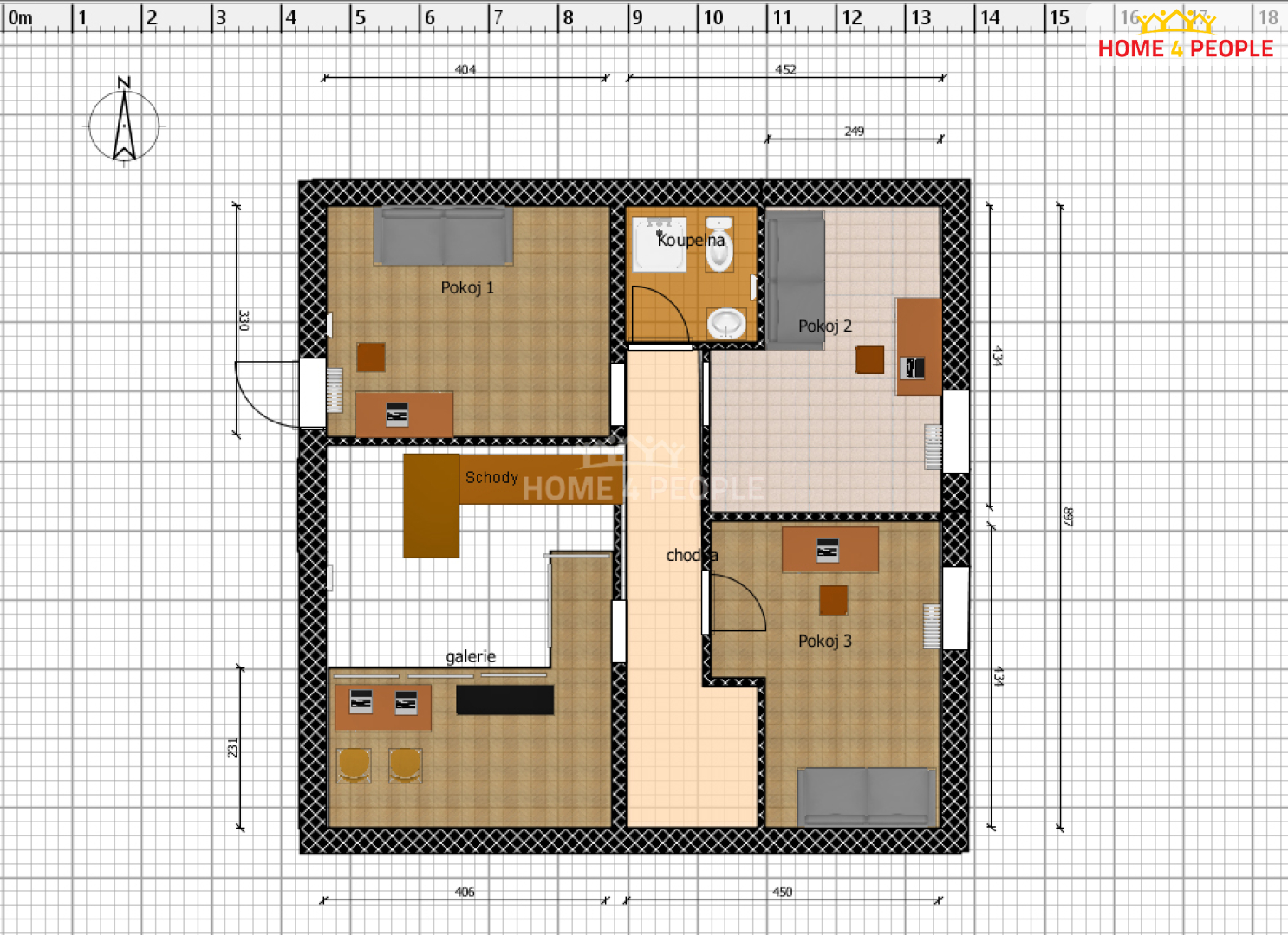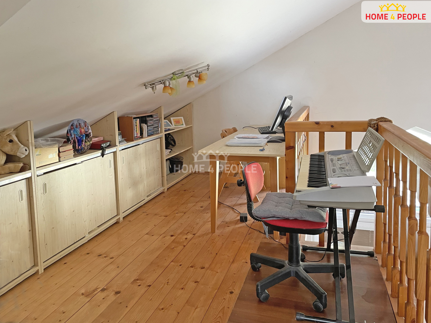 Z chodbičky v druhém nadpodlaží je vstup do tří dětských pokojů. Galerie s nízkými vestavěnými skříněmi je využívána jako učebna s PC a hudební koutek s klávesami.
