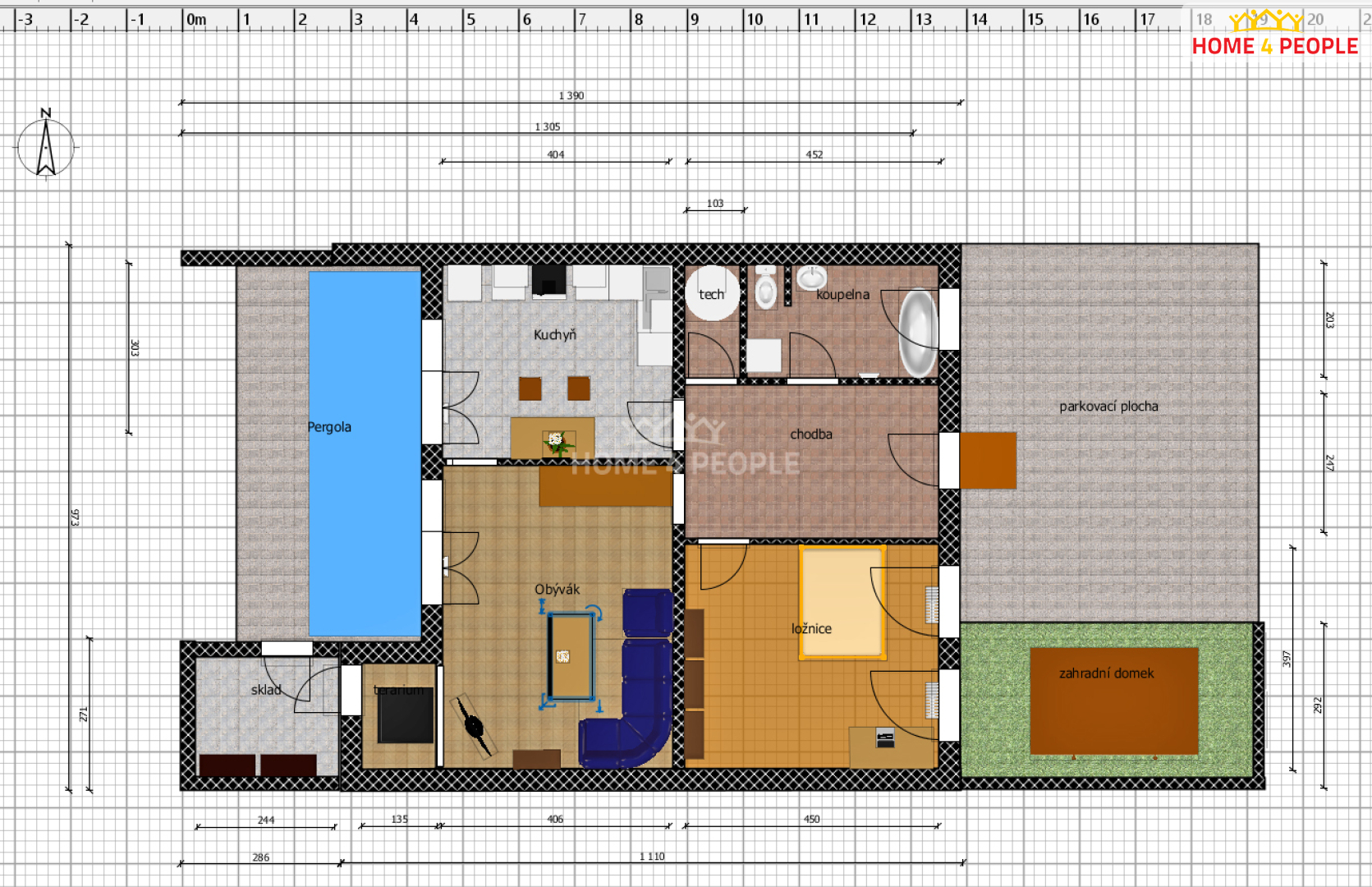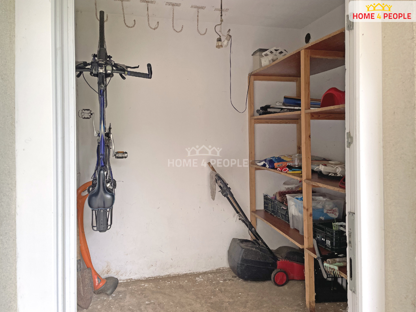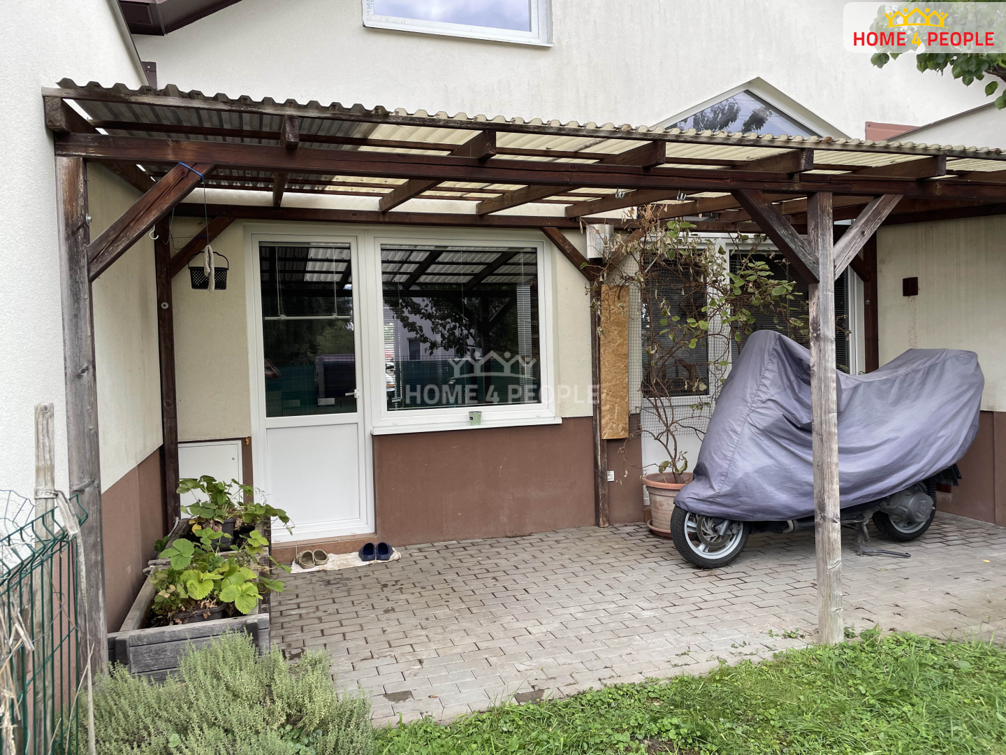 Z kuchyně je vstup do zastřešené pergoly se zámkovou dlažbou a malou zatravněnou zahrádkou se vzrostlým ovocným stromem. Také je zde vstup do venkovního skladu, který navazuje na budovu. Sklad je využíván pro umístění technického nářadí, kol a sekačky.