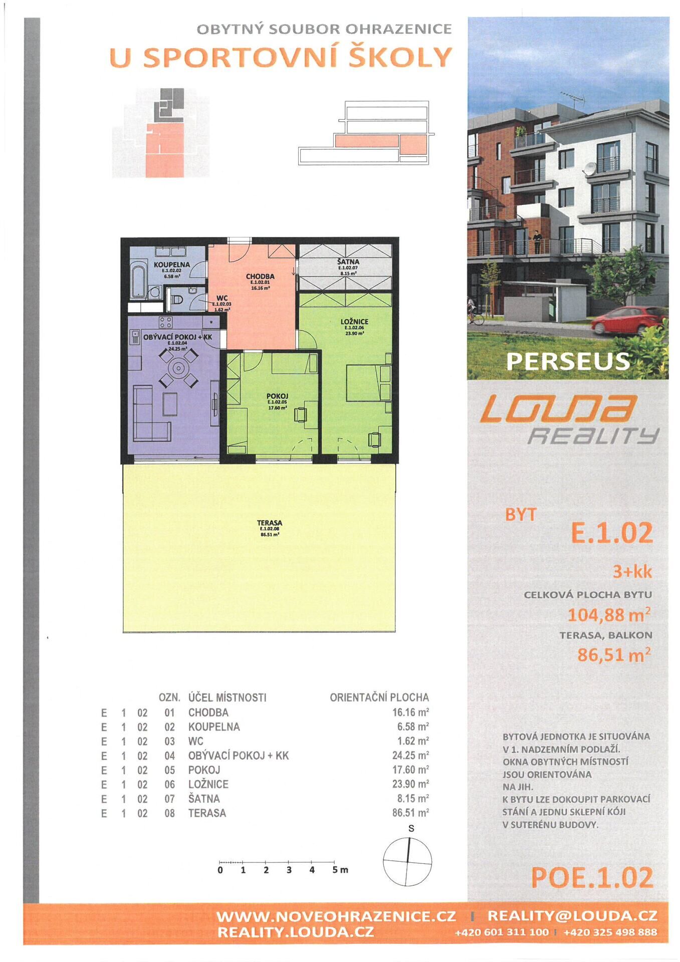 Nabízíme Vám k prodeji novostavbu hezkého bytu 3+kk z developerského projektu Nové Ohrazenice v Pardubicích. Bytový dům Perseus, ve kterém se byt nachází, je dokončen a zkolaudován. V domě je umístěn bazén pro batolata a děti předškolního věku s dětským koutkem a sálem na sportovní aktivity. Byt s označením E1.02 se nachází ve zvýšeném 1. nadzemním podlaží (cca 2 m nad okolním terénem) tří podlažní budovy s pouze 10 byty. Celková obytná plocha bytu je 105 m2. V uvedené výměře není započítána velká terasa o výměře 86,5 m2. Celková užitná plocha bytu s terasou je dohromady 191,5 m2.